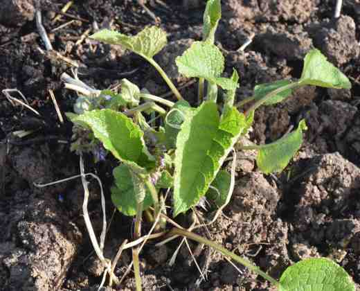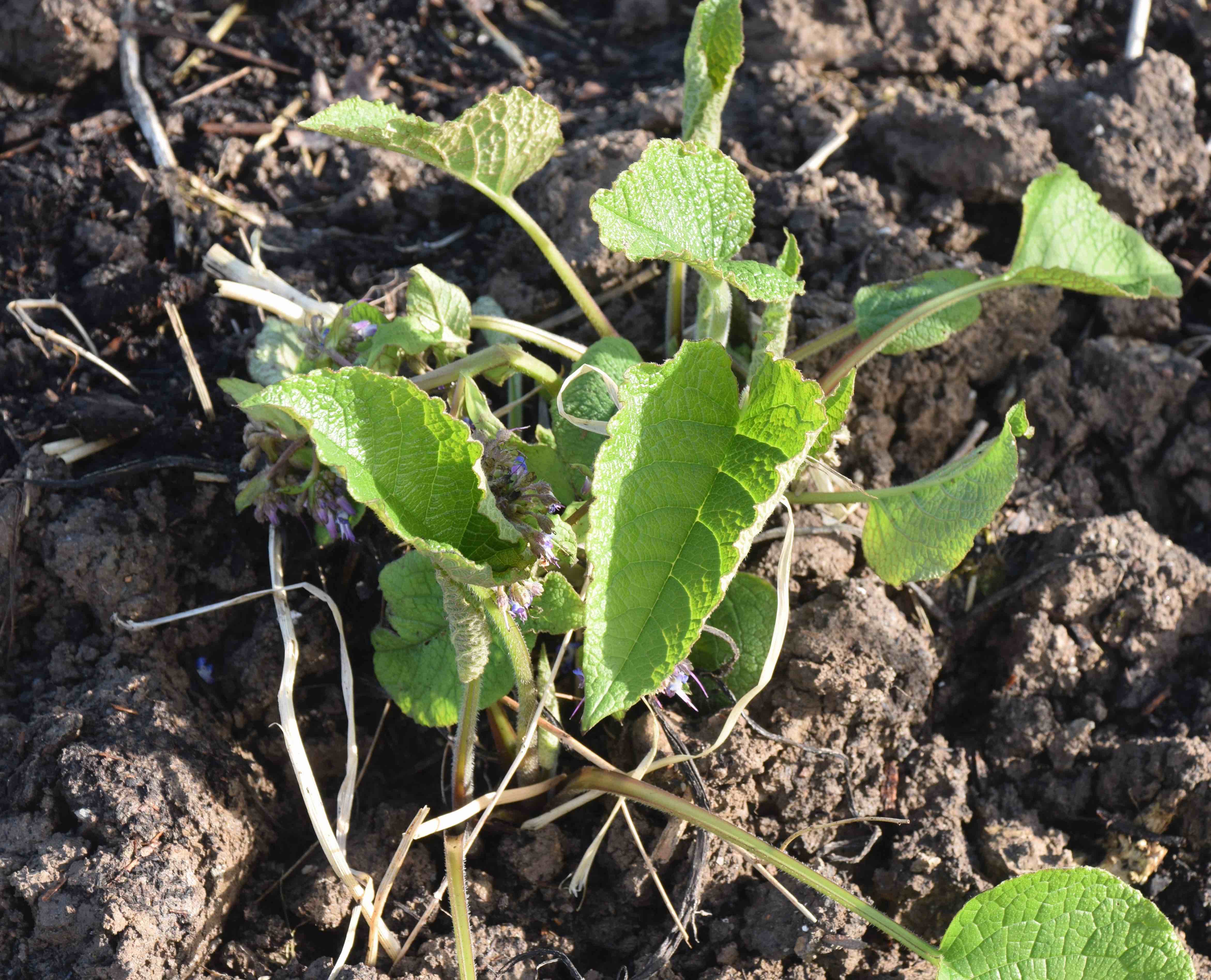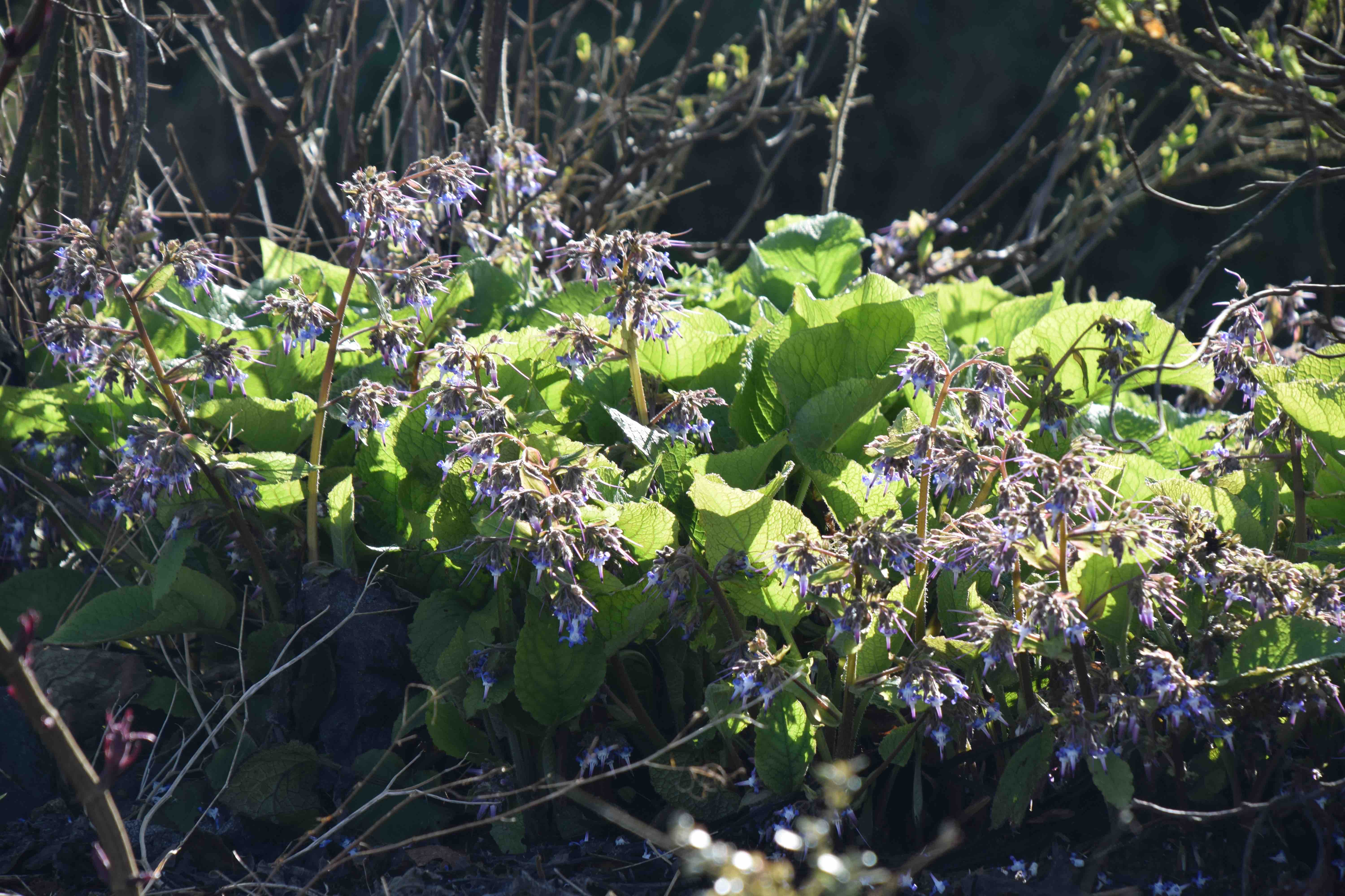 Trachystemon is a great ground cover for shade, with weed-suppressing large, rough, heart-shaped leaves. In spring (now) it produces masses of spiral, blue and white flowers that are adored by bumblebees – on warm days. The plan is that it will not only smother weeds and keep the soil covered with vegetation but that it and the comfrey will attract bees that then might visit my apple blossom!