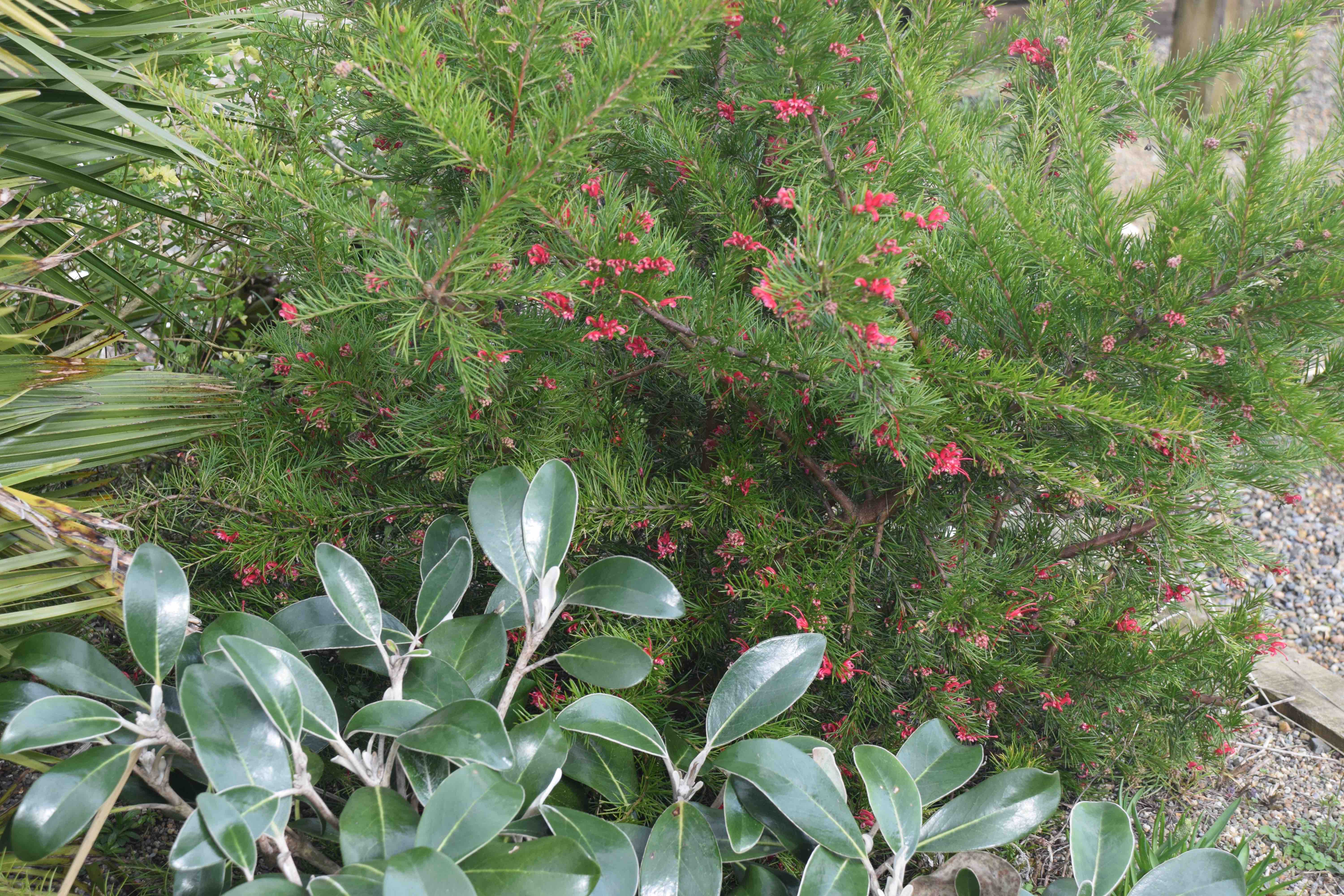 Just the other side of the Grevillea ‘Canberra Gem’ which is just starting to bloom, is Pachystegia insignia, the Marlborough daisy. Not a common garden plant, it is worth growing for the shiny foliage alone, though the flower buds and open flowers are lovely too.