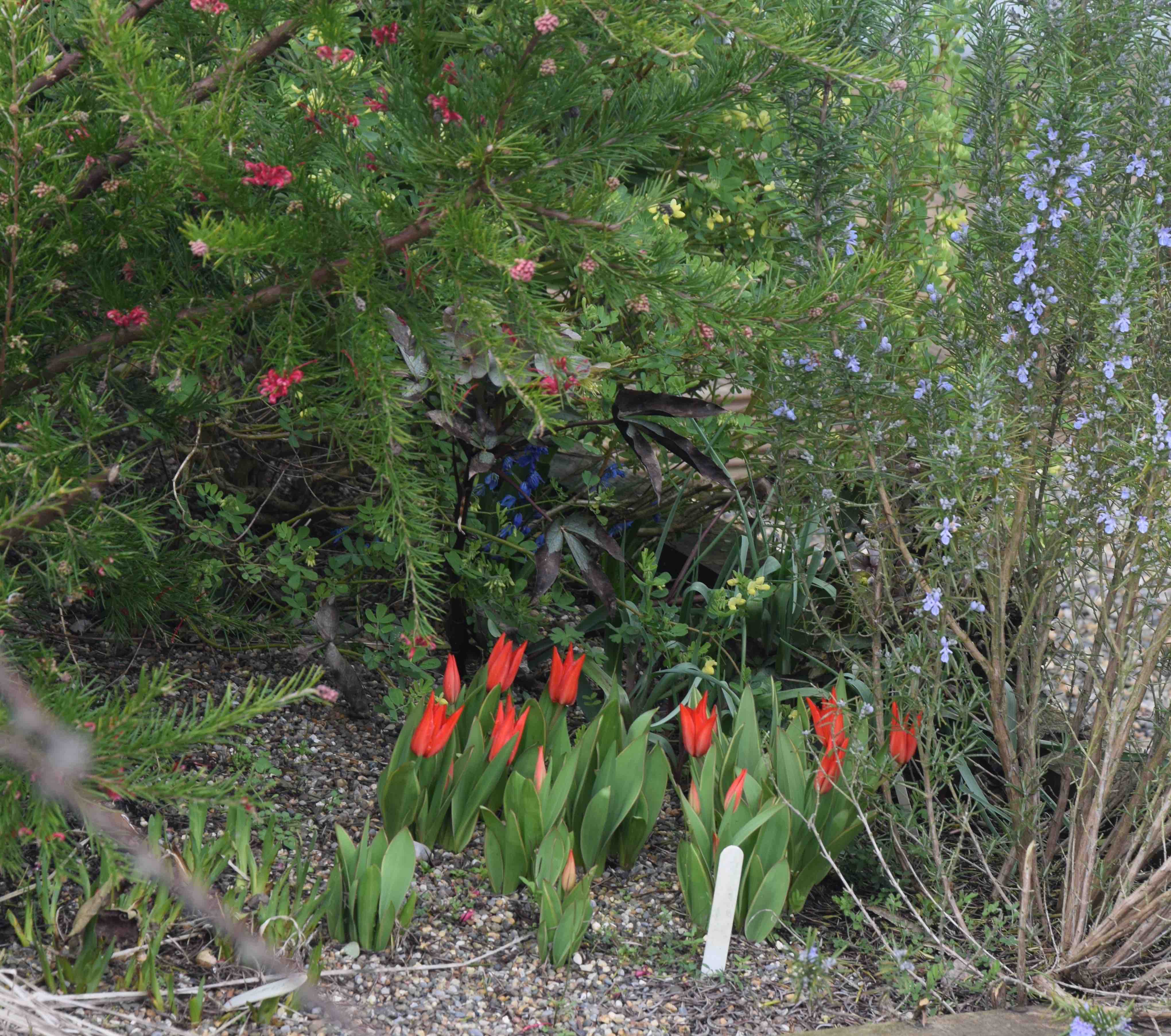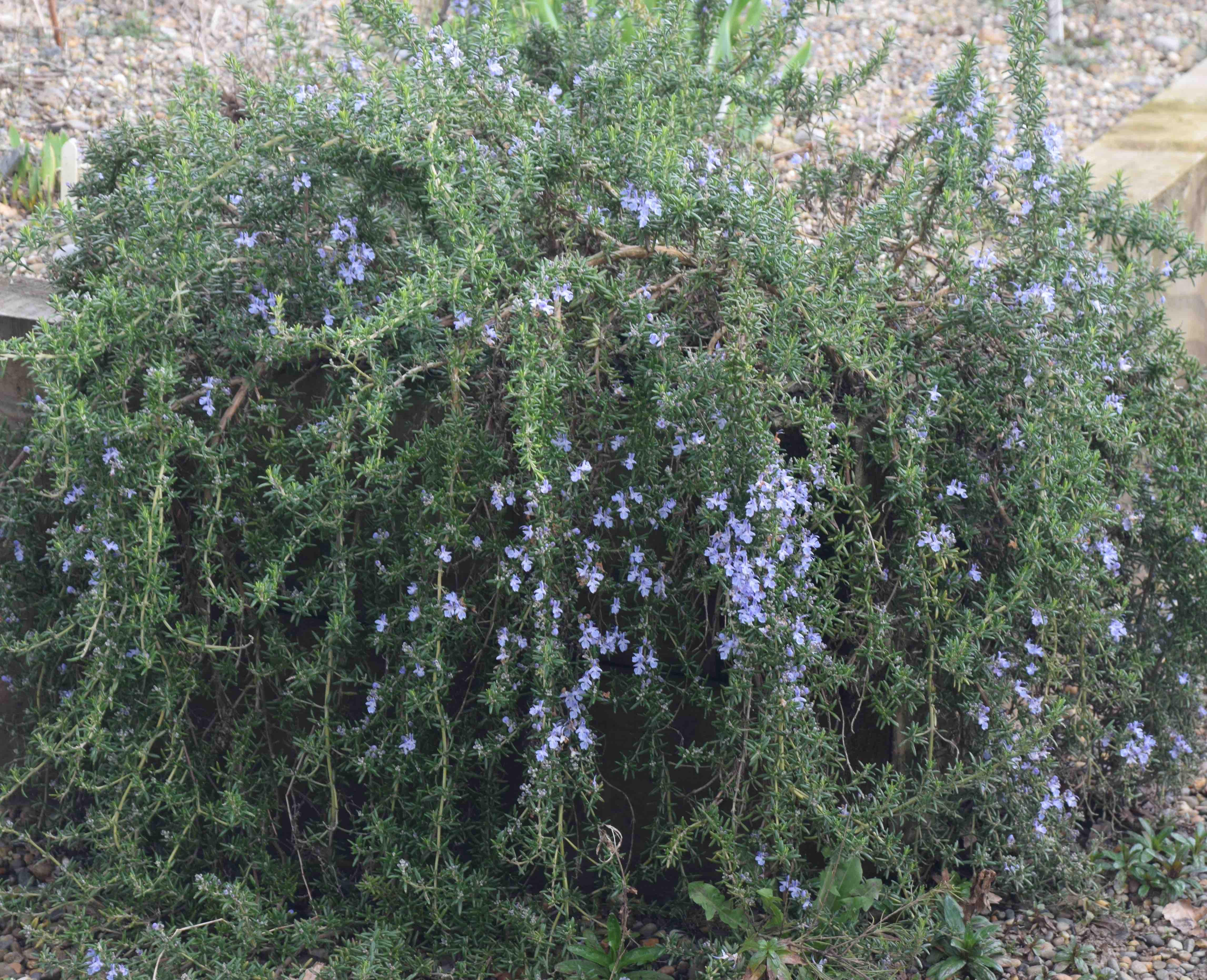 Rosemaries are starting to bloom and their flowers are popular with the early bumblebees, as is the grevillea. The creeping rosemaries are not as hardy as others but have managed to get through the wet winter and the early cold snap of -6c, as have the grevillea and pachystegia.