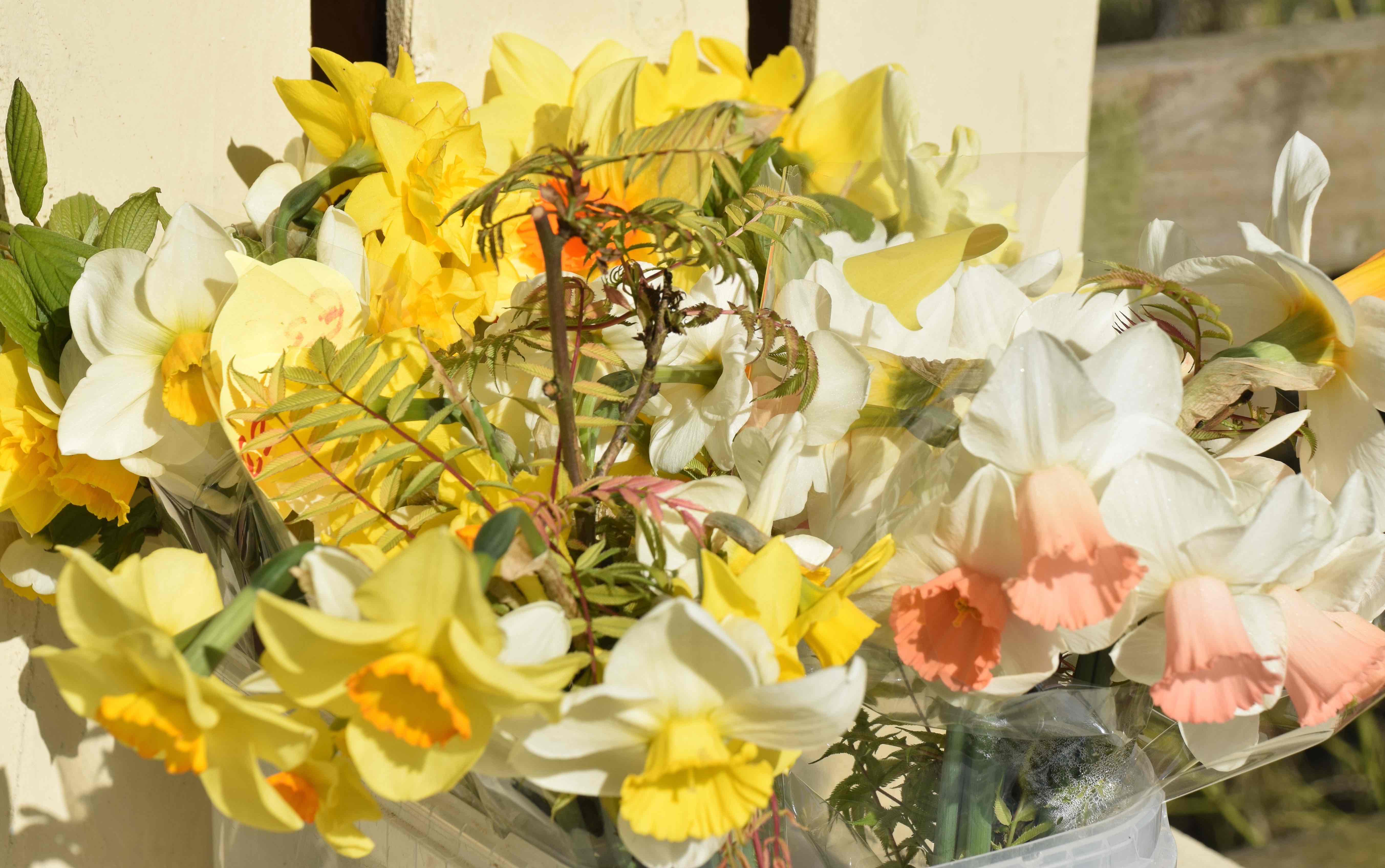 This weekend will be the fourth of the year selling flowers for charity. The daffodils are still supplying the majority of the bunches. Picking is slower than usual because so many flowers have been chomped by slugs and snails. Even if half-eaten they look OK in the garden but can’t be put in bunches.