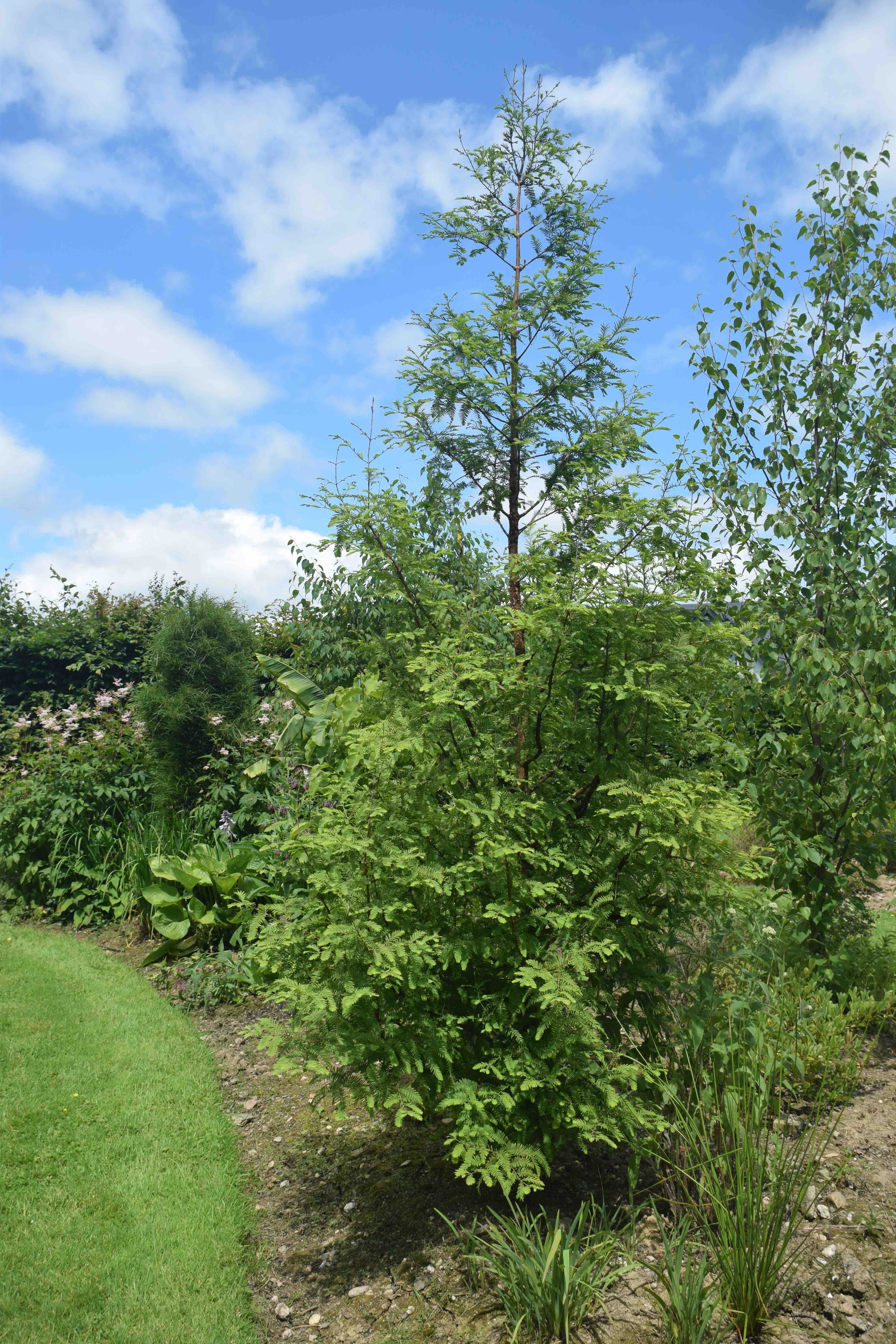 One of the plants that makes me very happy is the metasequoia in one of the lower beds in the garden. It is soggy in winter and the soil is not great but I expected it to be OK. Planted at 1m high it has rocketed away and it delights me with its vigour and grace after four years. A self-sown rush at its base, beside ‘schizostylis’ is evidence of the poor drainage. When I planted the metasequoia I really wanted the bight yellow ‘Golden Oji’ (Gold Rush) but was worried about it growing well in the spot. So I chose the plain green which I hoped would be less demanding.