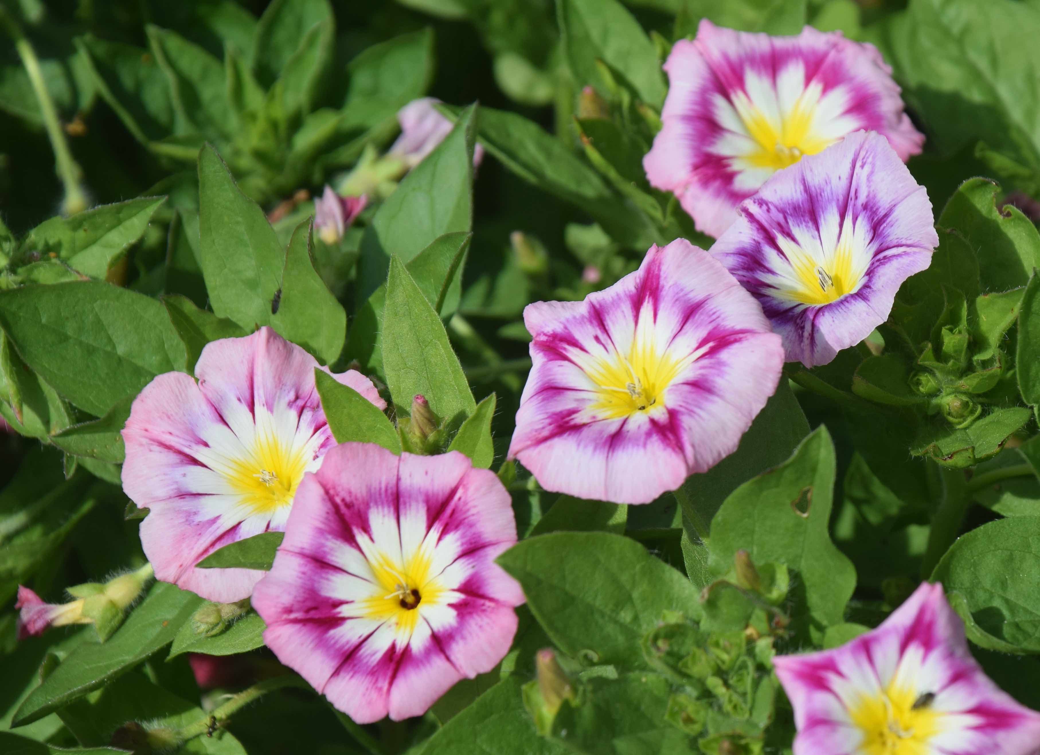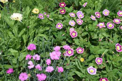 The ‘tricolor’ bit refers to the flowers being typically blue with a white zone around the yellow centre. Mixtures can and should contain pure whites, good pinks, crimsons and even some nice purples. I chose just pinks for this year and the seeds are easy to grow. They can be sown direct but I sowed in cell trays. Unlike some annuals these do not start flowering as tiny plants but need to build up a head of steam before they bloom. And as they do the neat domes of foliage rapidly expand into sinuous stems that spread so each plant is at least 60cm across.