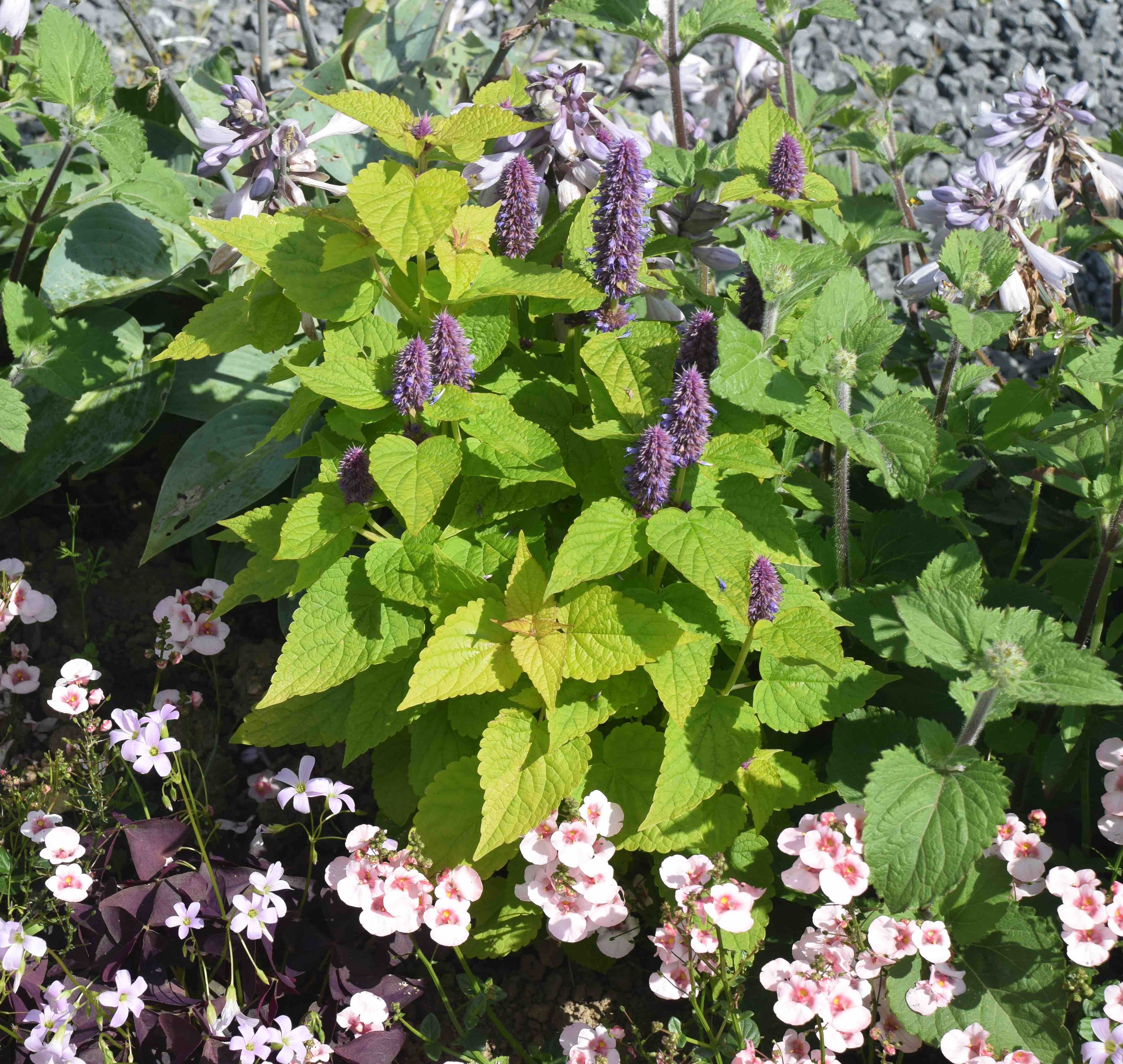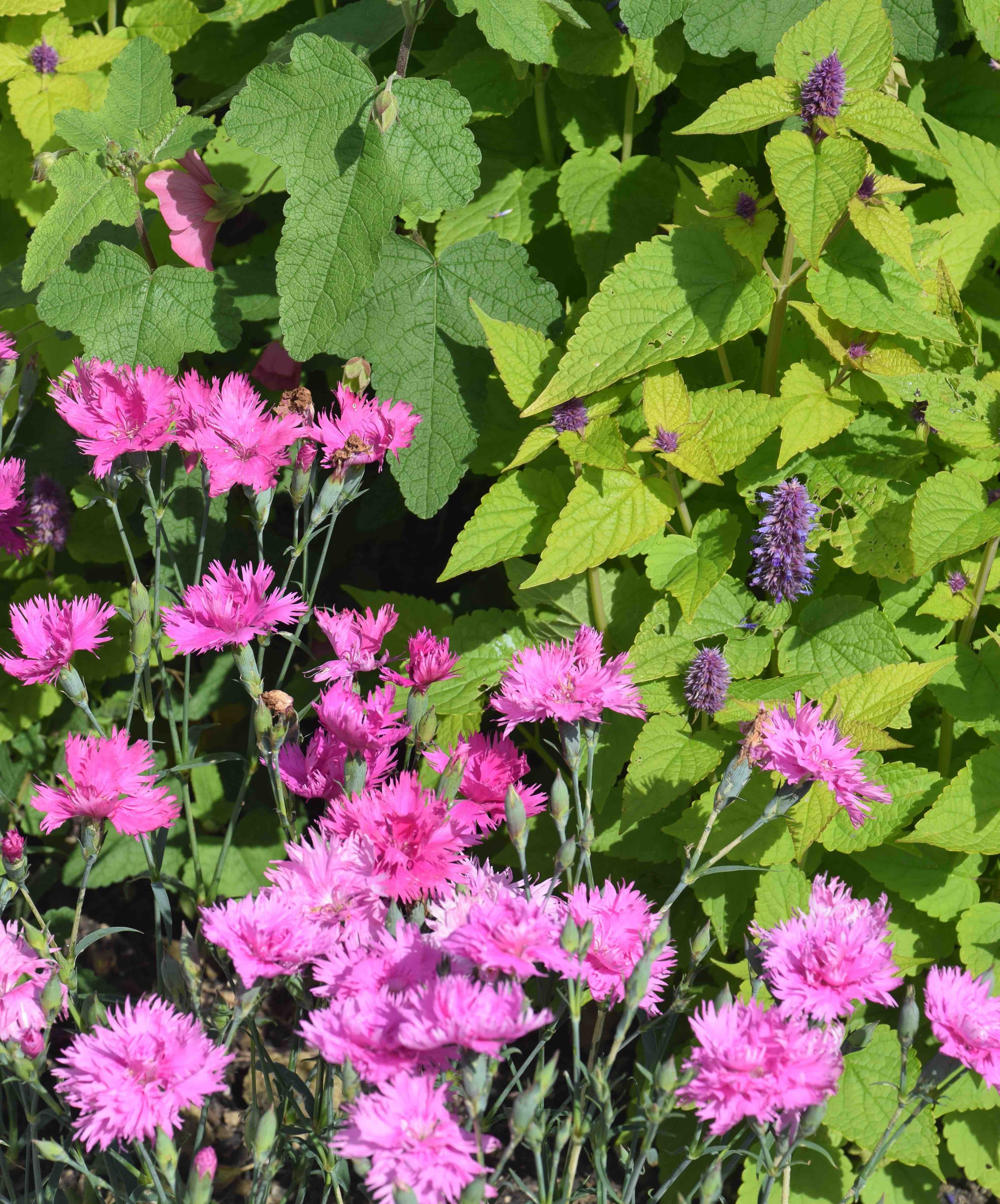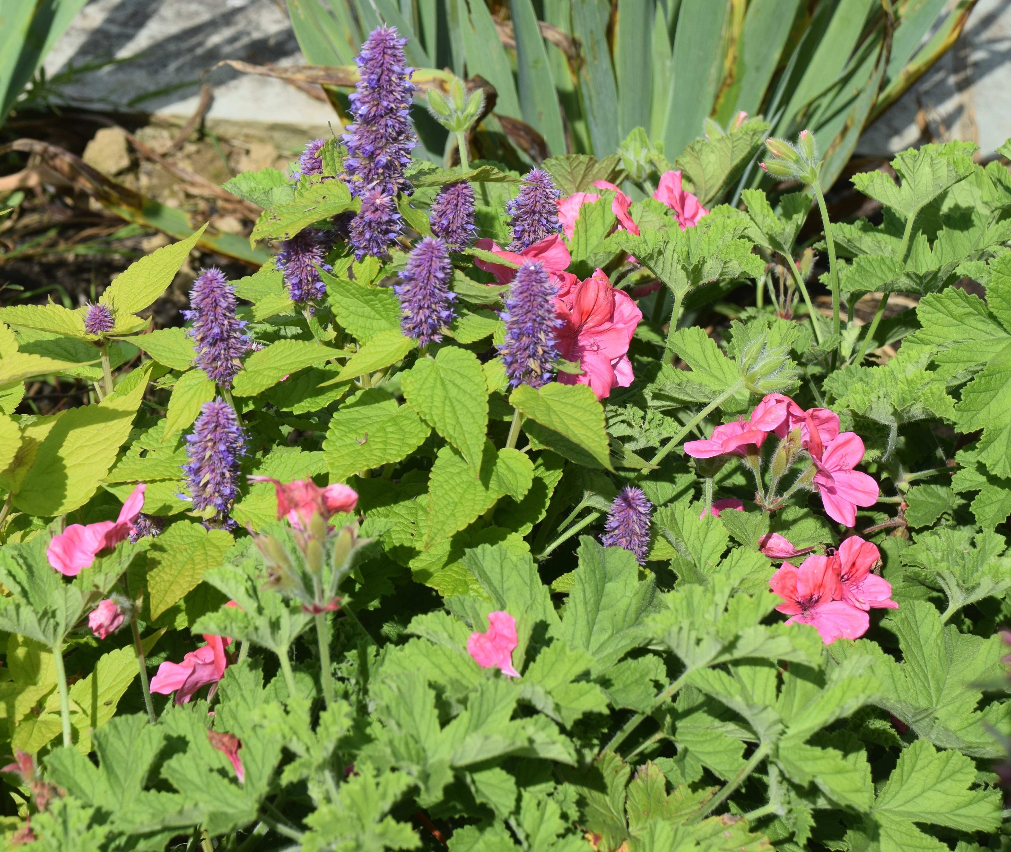 ‘Golden Jubilee’ is a very different plant and is quite tough. It thrives in good soil and can grow to 60cm or so, the bushy plants well clothed with large, rough, rather nettle-like leaves. They are soft yellowy lime, tinged with bronze when young, varying according to sun and soil moisture. Each stem terminates in a dense head with small, tubular blue flowers opening over many weeks. I find the foliage colour very useful and it ‘goes’ with the pink dianthus in the pics and the searing colour of pelargonium ‘Clorinda’ as well as purple oxalis and blue hostas.