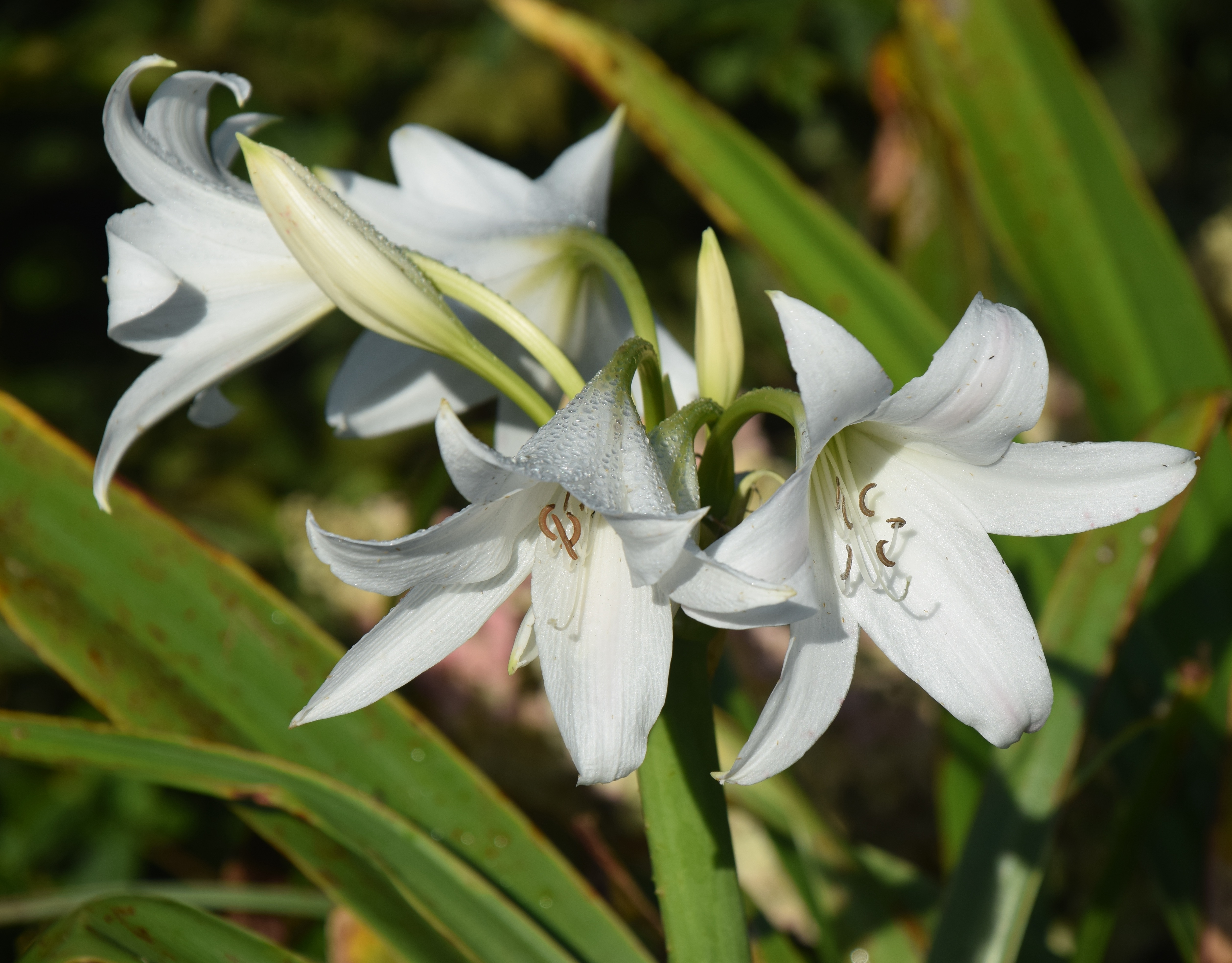 In general, crinums need sun, warmth and plenty of water and feeding. The only other crinum I have is a purple-leaved form of what I believe is Crinum asiaticum. I have had this just as long but have never really made it happy. It has been in a pot, kept frost free in winter, but although it offsets readily it has only tried to bloom once, the spidery, highly fragrant flowers quickly munched by snails. I decided to divide the, by now crowded, clump this spring, keeping one clump in a pot in the polytunnel and the others planted in a raised bed with cannas. Each clump was of three or four bulbs. None seem very happy but they are growing. I don’t think any will reach flowering size this summer.