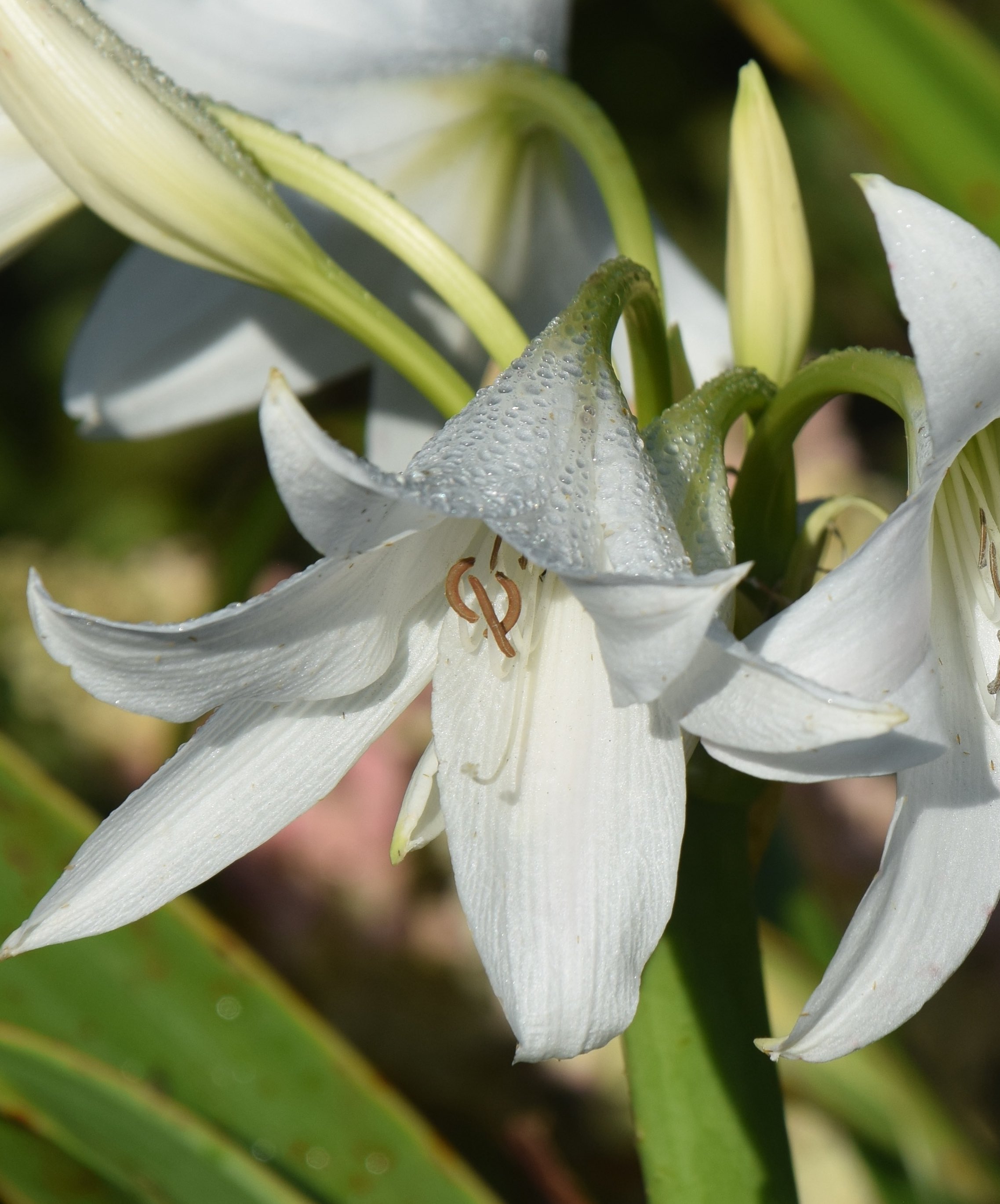My crinum has finally bloomed. I noticed a scape growing from the base about three weeks ago and I was actually quite annoyed. Let me explain. I bought a potful of bulbs about five years ago and was very pleased with myself. It was a large pot with at least five bulbs in it and it only cost €10. Because you can easily pay that for one bulb I came away very happy. And since the bulbs have permanent roots and do not like being dried out for long periods my potful was not going to have a check to growth and should have romped away. It was planted in a border that faces east (not really ideal) but it gets sun for most of the day and in the early years the hedge was too small to cast shade so I expected it to be happy. But I got nothing but leaves.