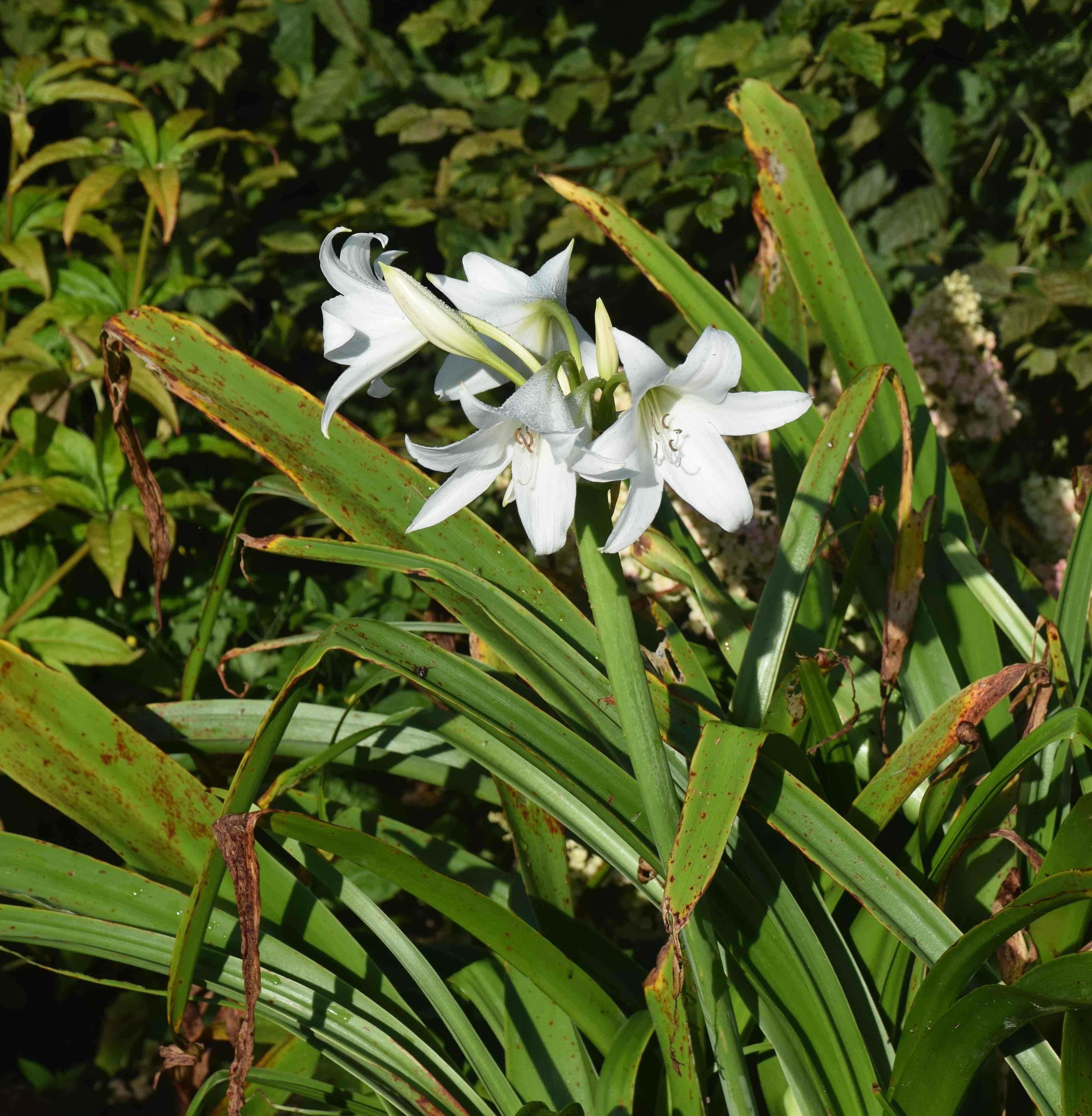 As it turns out, my Crinum x powellii is ‘Album’ with white rather than the usual pink flowers. Some crinums have fugacious flowers, lasting only a day, but this one has blooms that last four or five days. It is very beautiful and is fragrant though being in the middle of the border it is not easy to get to. There is some talk of the flowers being larger than the usual stocks of the pink form. It is likely that the hybrid was created many times.