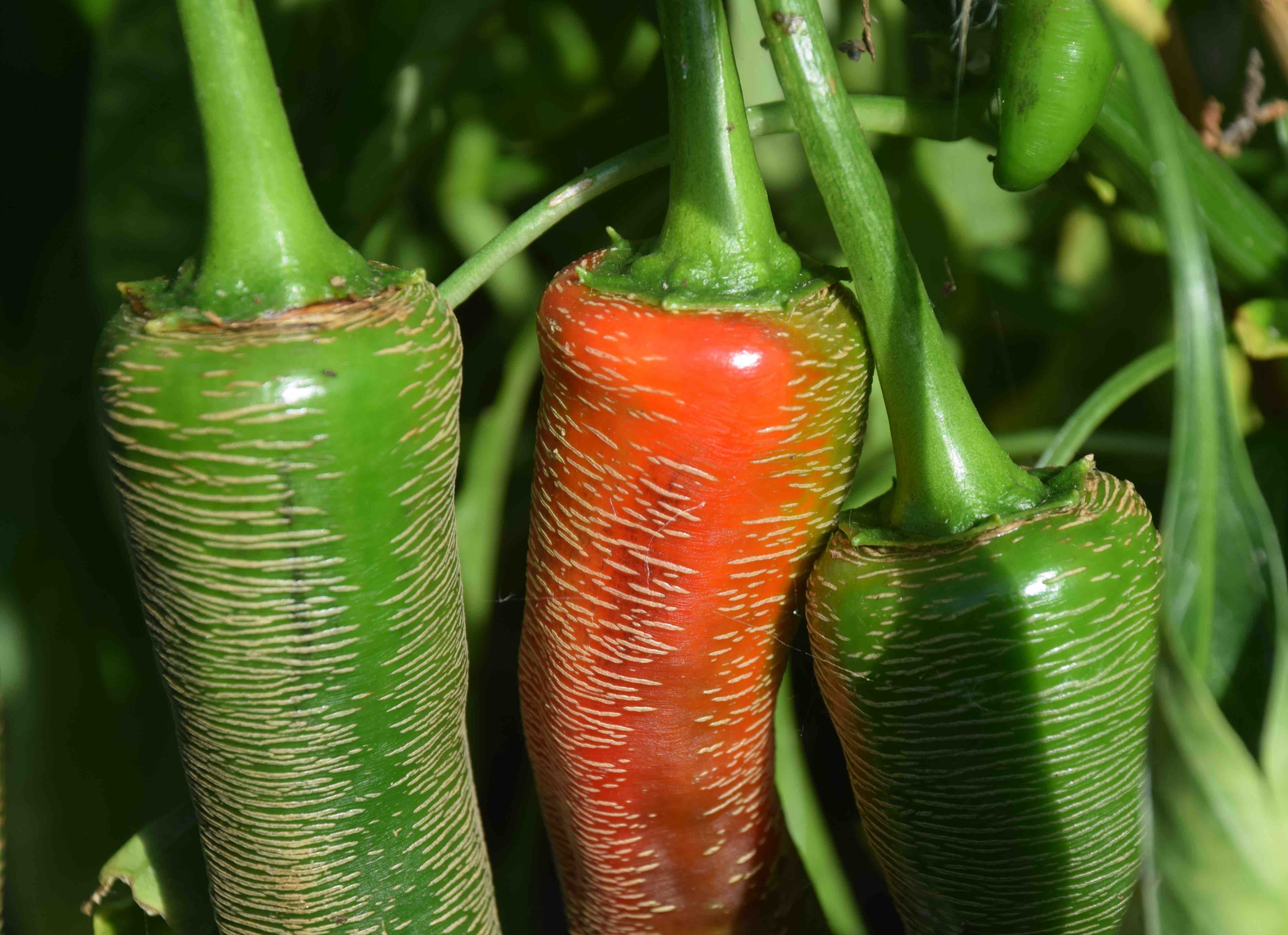 This is a beautiful chilli with corky stripes across the fruits. It is ‘native’ to Kosovo and has long chillies that can be 20cm long. Unfortunately I have a problem with them because, as they start to ripen, the blossom end starts to rot. The photo above is cropped to disguise the fact. I decided to pick it after I took the photo and cut off the rotten part and at the top – or is it the bottom! There are several more fruits and I hope, and expect, that the recent warm weather will mean that these later fruits will ripen properly. It is supposed to be mild and with good flavour. Now I have tried it I can affirm that the flavour is very mild. I treated it with respect but if there was a shock it was just how mild it was. I tasted a bit raw, ready to rush for the cheese to take away the pain but there was none. It is a good choice for chilli cowards. (Capsicum annuum)