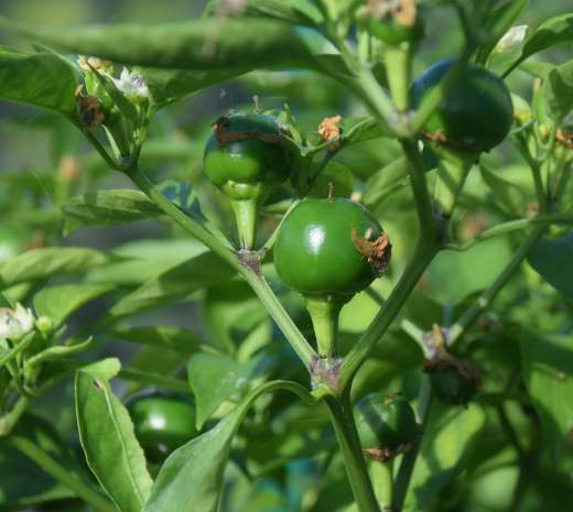 Last year I had a good crop of Hungarian Black, a fairly mild chili. They start out black and ripen bright red. A slow start this year, but some peppers are forming now. I grow them in pots outside.