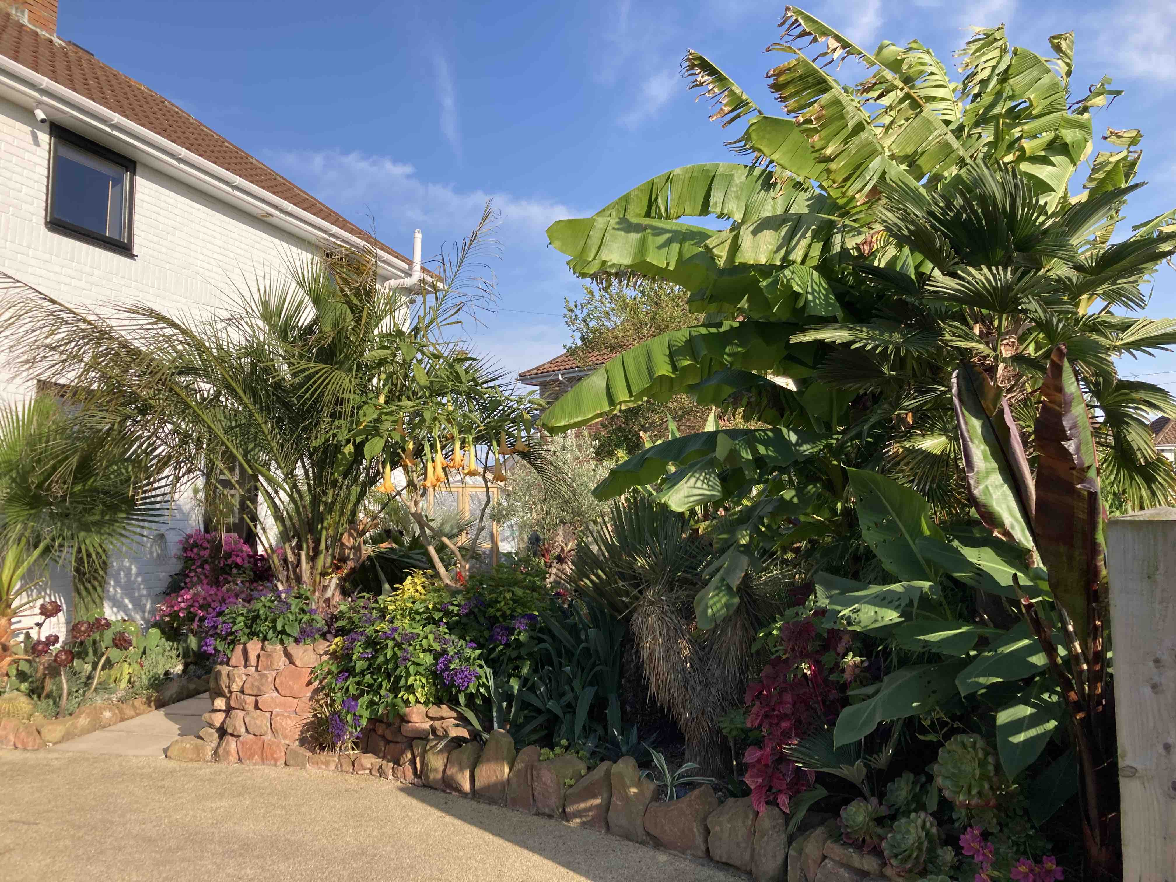 On a more positive note, since this post is a bit scary so far, my wanderings revealed a wide range of front gardens and although most were the usual weeds, wheely bins and hydrangeas surrounded by crazy paving, there were exceptions and one that I walk past every time I go stands out as exceptional. It s a small garden and a front, corner plot but amazing. The use of the word oasis is rarely as appropriate as for this garden which is packed with subtropical plants. It shows that nothing succeeds like excess and that if you are going to go for the tropical look you need to go all out! As well as musa, there are Phoenix canariensis and washingtonia and butia palms, bamboos, agave, aeonium, brugmansia and heliotrope and even some bromeliads strapped to trees. The garden is largely paved, for parking, but the planting is effusive and even the rockwork enhances the planting. I think the owners have done an amazing job.