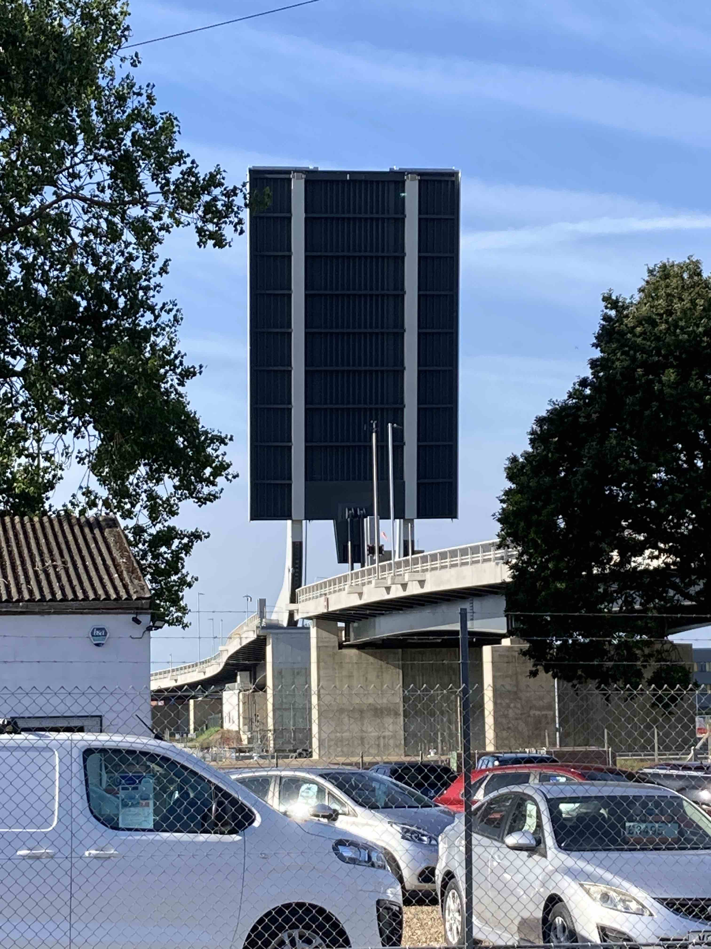 The bridge is a bascule bridge which means it is like a drawbridge with a counterweight. The span here is 39.5m wide and the bridge weighs 1100 tonnes including 380 tonnes of concrete counterbalance. In the upright position the tip of the road is 60m above the water. It is the largest rolling bascule bridge in the world lifted with hydraulic cylinders.