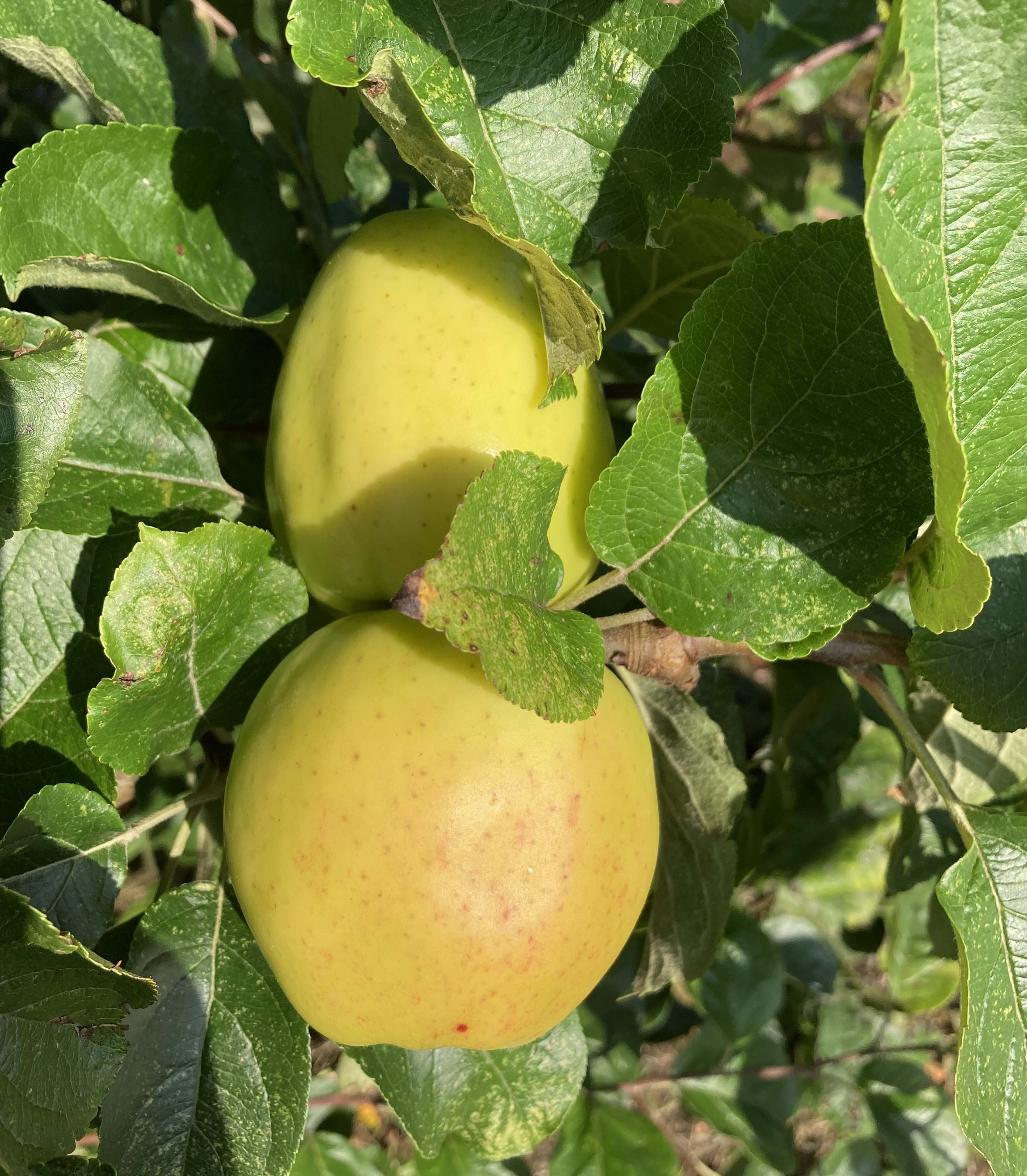 Spring was cool and windy but there were few frosts so I was hoping for good crops of fruit. But things proved different. ‘Set’ of apples and plums was poor and not one pear formed. The damson did set the first fruit in its short life so I have enough for a teaspoon of jam but blackbirds have pecked every apple that shows red coloured skin. Last year there was a good crop of the early ‘Irish Peach’ but this year the birds ate every one. But a few apples have managed to produce a small crop. ‘Gibbon’s Russet’ is by far the most vigorous and healthy of all the apples planted. Fungal canker has been a real problem this year but this apple, which is an old Irish apple, is very healthy. The fruits are large but do not actually show much ‘russeting’ which is of concern. When cut open the fruit appear not to have ‘set’ properly and the seed cavity is misshapen with few seeds. The skin is greasy. As to eating, if cut to remove the malformed core they are delicious. The flesh is crisp and very juicy – crunchy – and does not leave you with a mouthful of ‘pap’. The taste is ‘vibrant’ – acid and sweet and rather like sour apple sweets. I prefer complex apple taste and can’t bear ‘Granny Smith’ apples but this one is really delicious and refreshing and tastes like ‘pure apple’.