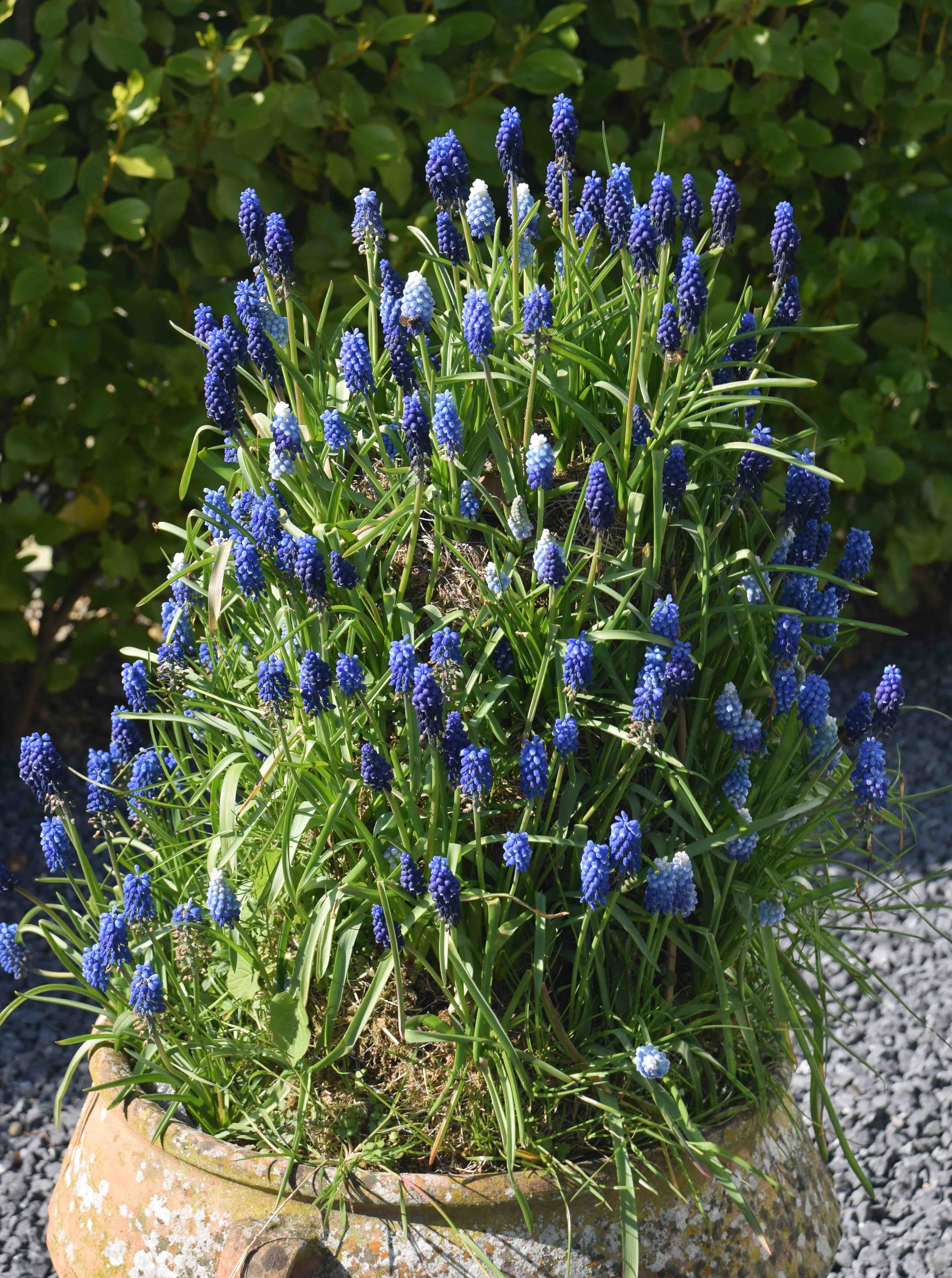 I experimented with a wire cone of muscari again. It worked but I ruined it by planting three different kinds and they did not all bloom at once. I should have stuck to 150 of the same kind but, as I intend to replant them once dried out, I baulk at buying all the same kind. But it did spoil the effect a bit.