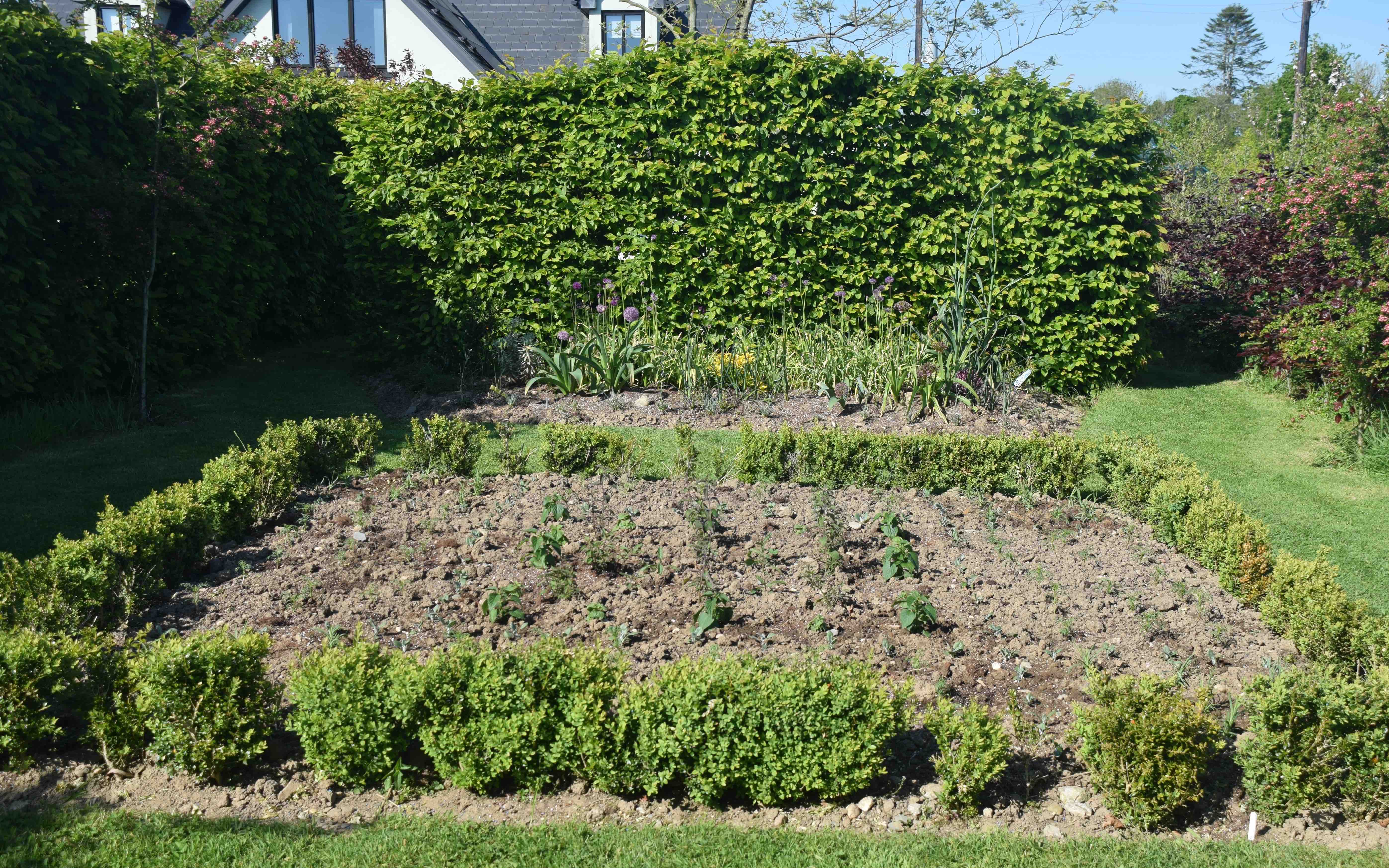 This area is finally becoming enclosed. The formality is supposed to be a contrast to previous areas and make the bedding plants in the box bed a surprise – though to whom I am not sure since I just planted all the bedding! The box were moved in early spring because a lot were lost to blight. So the intricate (LOL) pattern is now just an edging. It was my fault because I planted flowers too close to the box and it swamped them and stopped air and light getting to the foliage – thus box blight.