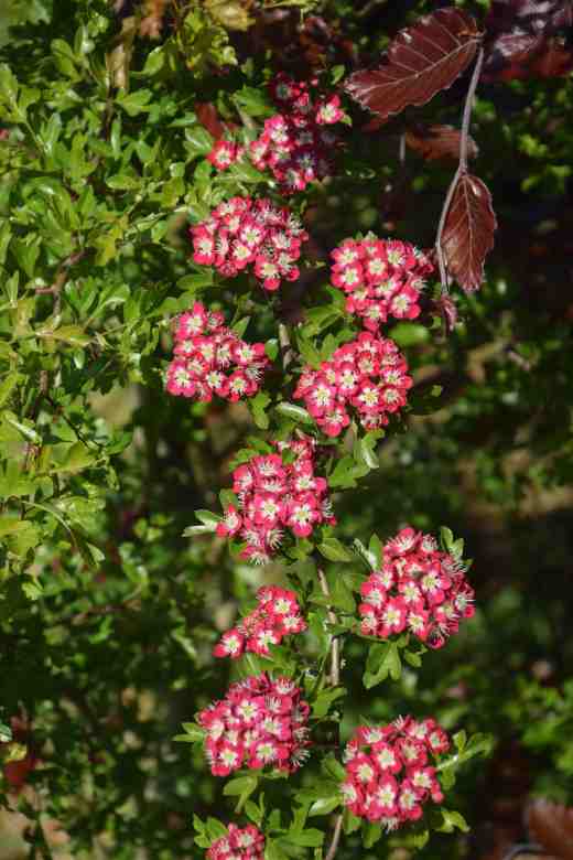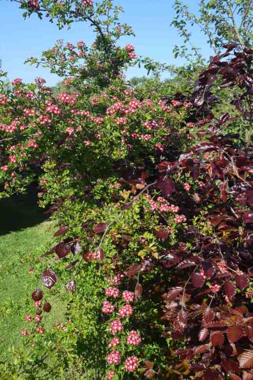 And now in their third year, the crataegus ‘Crimson Cloud’ are becoming small trees and flowering well. One is even beside some purple beech in the hedge and looks especially good. The beech did not like my awful soil and the hedge has been ‘infilled’ with hornbeam where beech died. So the hedge is mostly hornbeam with splashes of purple.