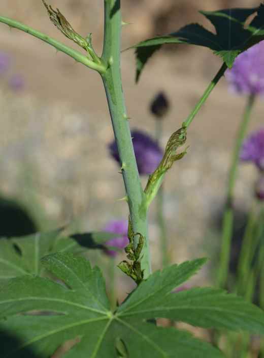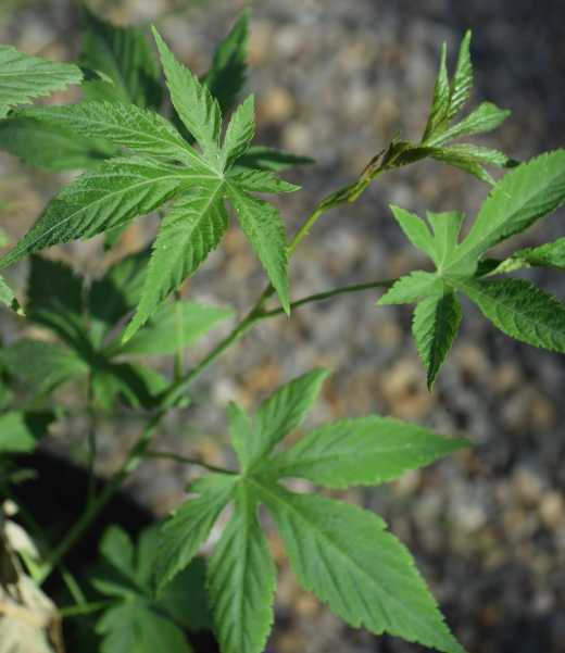 The foliage is attractive, in a ‘hemp-like’ way. The stems are moderately prickly but the leaves have very few prickles. The strongest shoot is now about 1m high and there are many sideshoots. It is not an awful plant for a patio pot and it may even encourage people round for tea if they think you are actually growing ‘weed’.