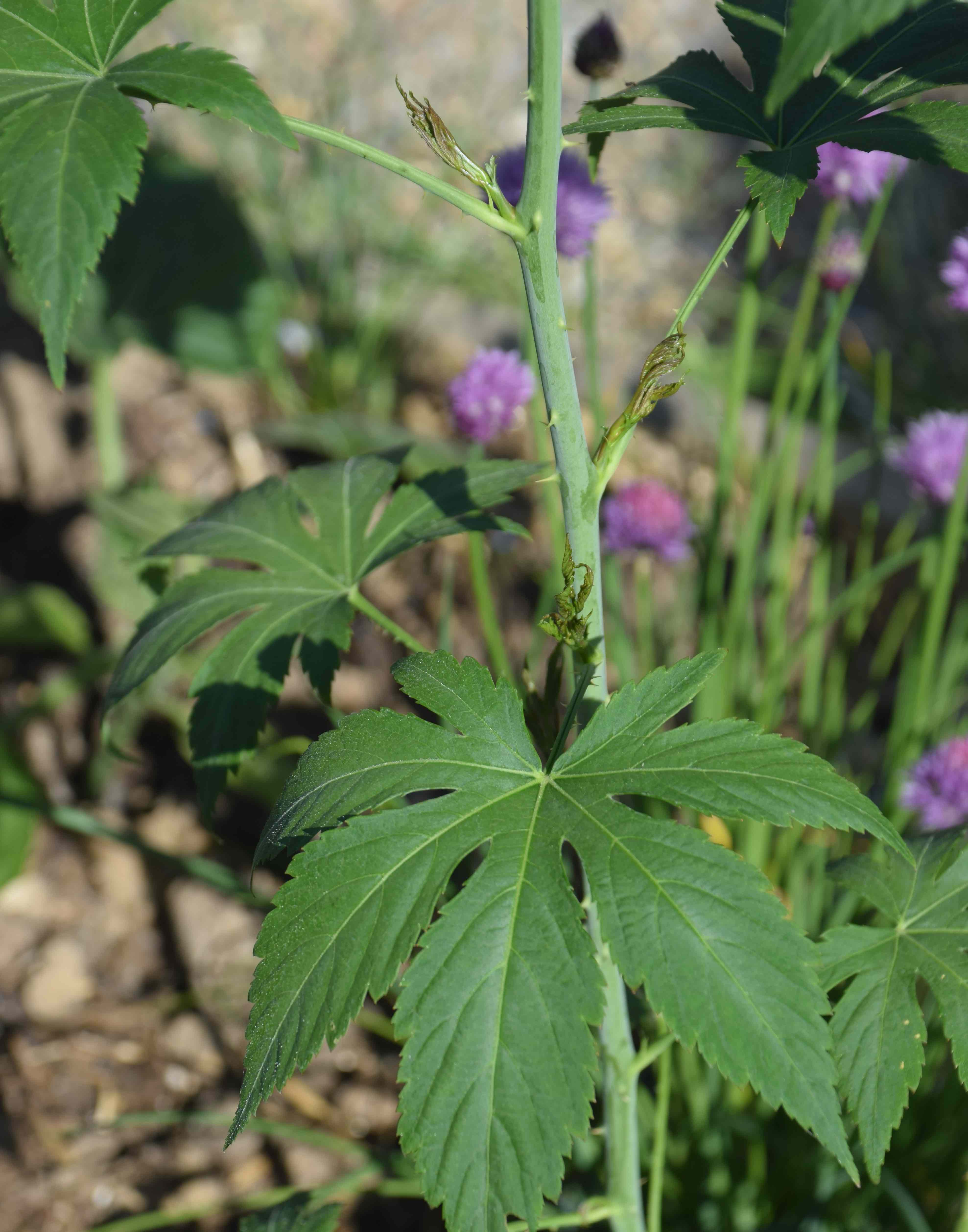 The foliage is attractive, in a ‘hemp-like’ way. The stems are moderately prickly but the leaves have very few prickles. The strongest shoot is now about 1m high and there are many sideshoots. It is not an awful plant for a patio pot and it may even encourage people round for tea if they think you are actually growing ‘weed’.