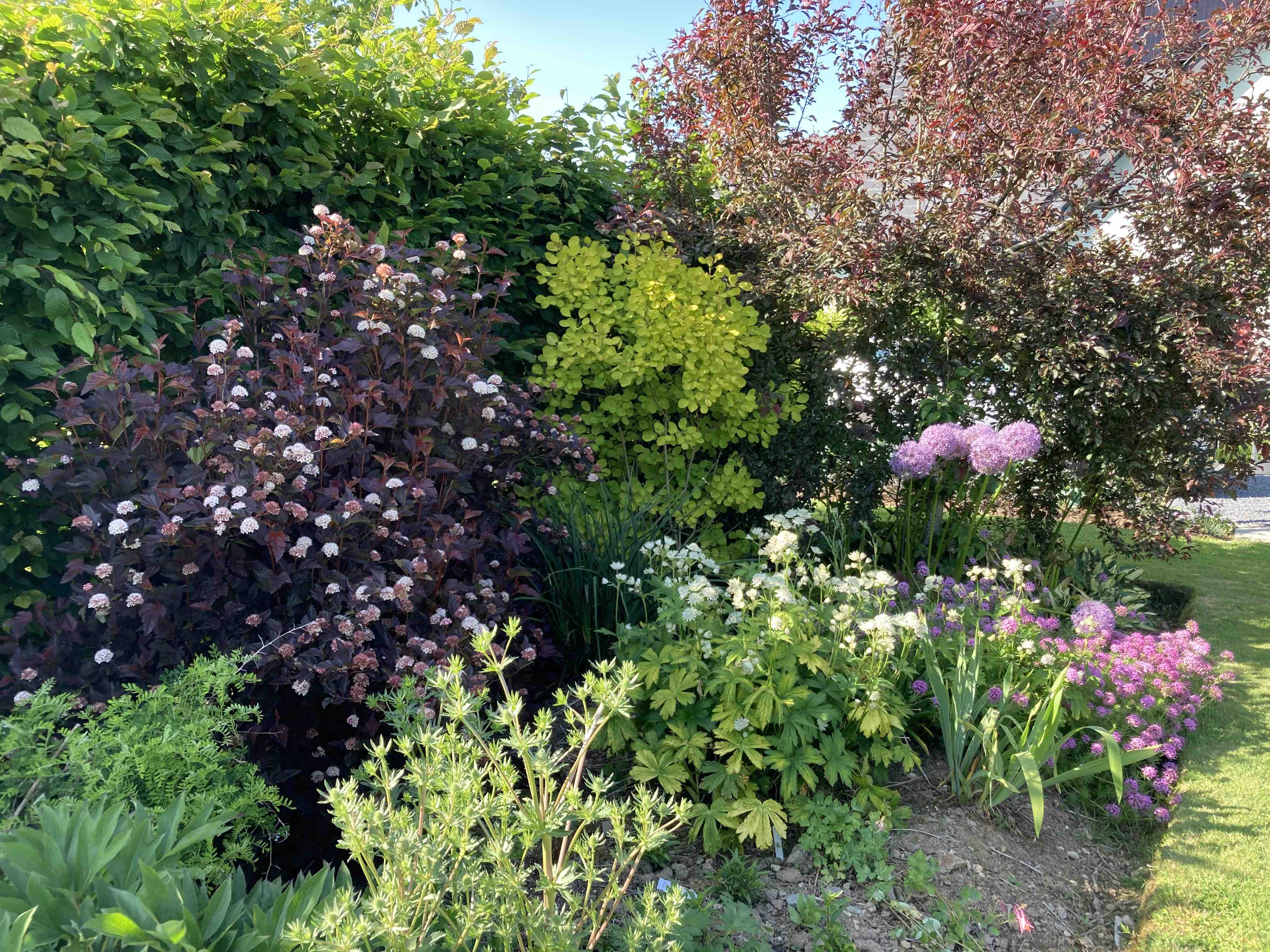 It is amazing how quickly the garden has grown, filled in, matured, especially the hedges which give such good structure and shape. What is the yellow-foliage shrub to the right of the Physocarpus, by the way?