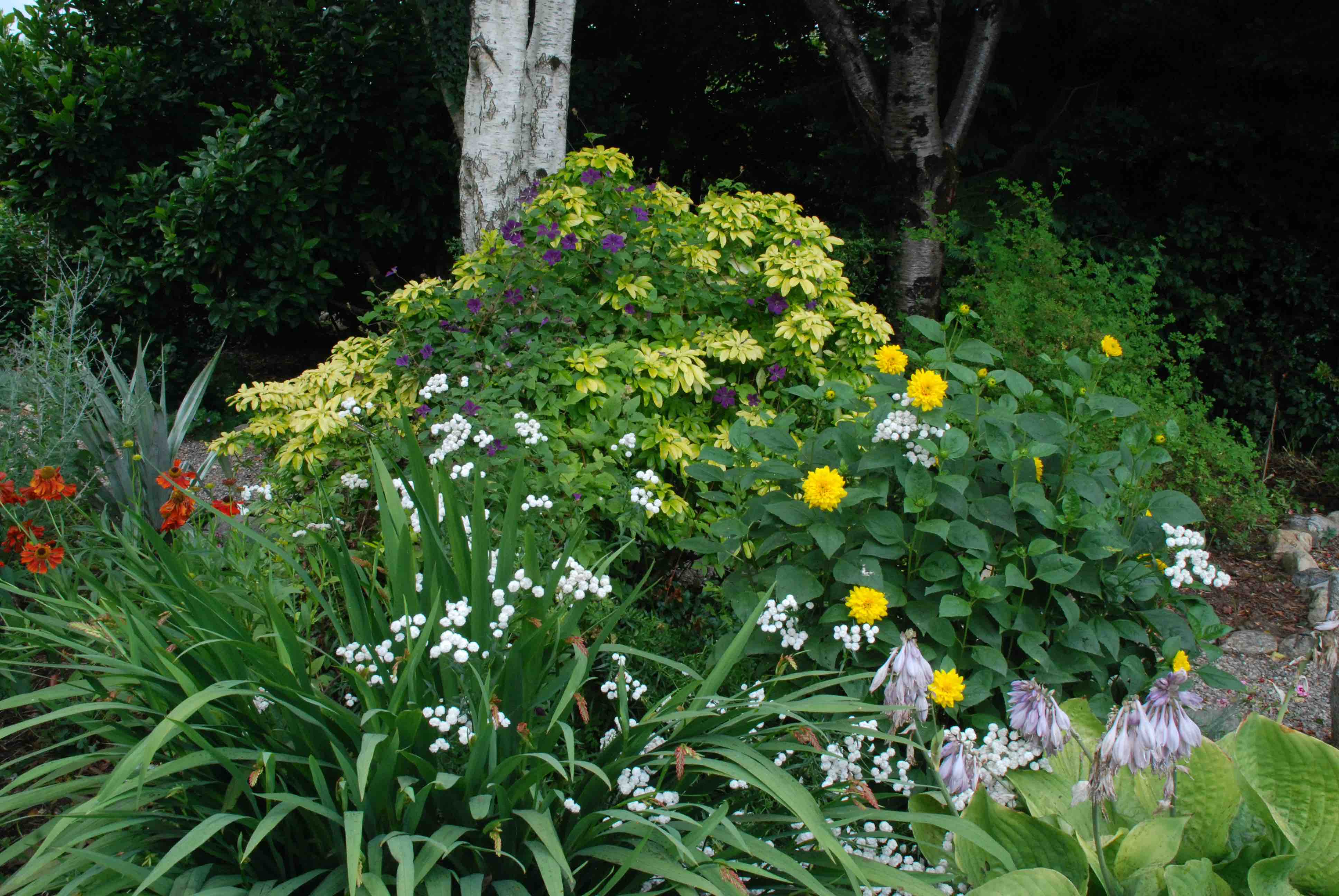 I am a rather cantankerous soul and there are some plants, that are loved by most people, that I won’t have in the garden. With so much choice, why not try something different? So, until now, Sundance has not been planted in this garden (I have planted it in previous gardens) but I had to do photos for my weekly Garden News column and it was ‘planting a shrub in summer’. I had to resist my urge to buy something rarified, which I wanted to spend my money on, and thought I had better plant something people would know. And Caroline at Coolacht suggested Sundance so I bought one and it was added to the lemon and white garden.