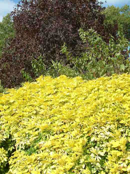 Despite its popularity, it is a bit of a Jekyll and Hyde. If it is planted in half shade it will be lime rather than lemon. And lower parts of the plant are usually rather green. In full sun it is potentially very, VERY bright lemon but if the soil is a bit too dry then the leaves, especially the shoot tips, are prone to scorch and go brown. Winter cold is also a problem and early or late cold spells can damage the shoot tips. These need to be pruned off to tidy it up but this will reduce flowering. But when it is at its best it is dramatic.