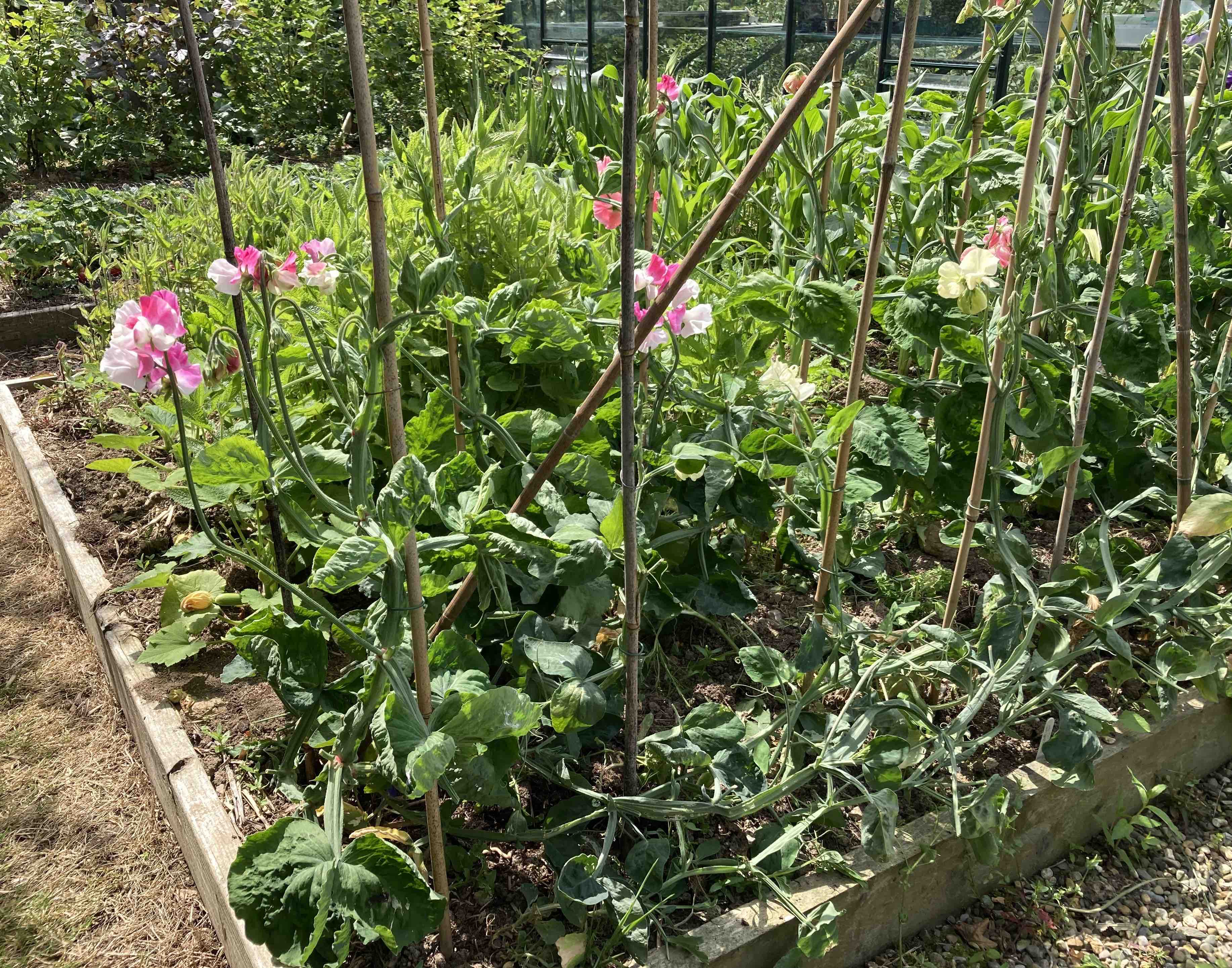 Every year I am astounded by the growth of the sweet peas. I sow them in October and overwinter them in the cold greenhouse. I planted them in March when they seem so straggly and weak. I am always worried that they won’t grow, but they are currently flowering well and have reached the top of their canes. I grow them as cordons – single-stemmed plants – up canes – and grow about 50 plants. Because I want strong, long stems, I tie them to the canes with wire rings and remove all the tendrils. This will encourage large leaves but also prevents the tendrils grabbing the other plants and flower stems. I also remove all the sideshoots. There is one in every leaf axil. It is a time-consuming job and I have to do it at least twice a week. By April the plants were starting to grow and thicken up but by this week some had reached the top of the canes. As they do so and the stems flop I was getting bent flower stems. Because they are grown to sell for charity at the gate, I want long stems and pick about five bunches for the second half of the week and get a few bunches for myself early in the week. Each plant will produce two or three stems a week.