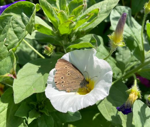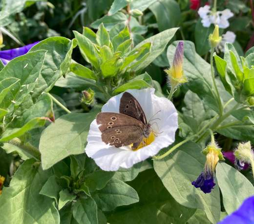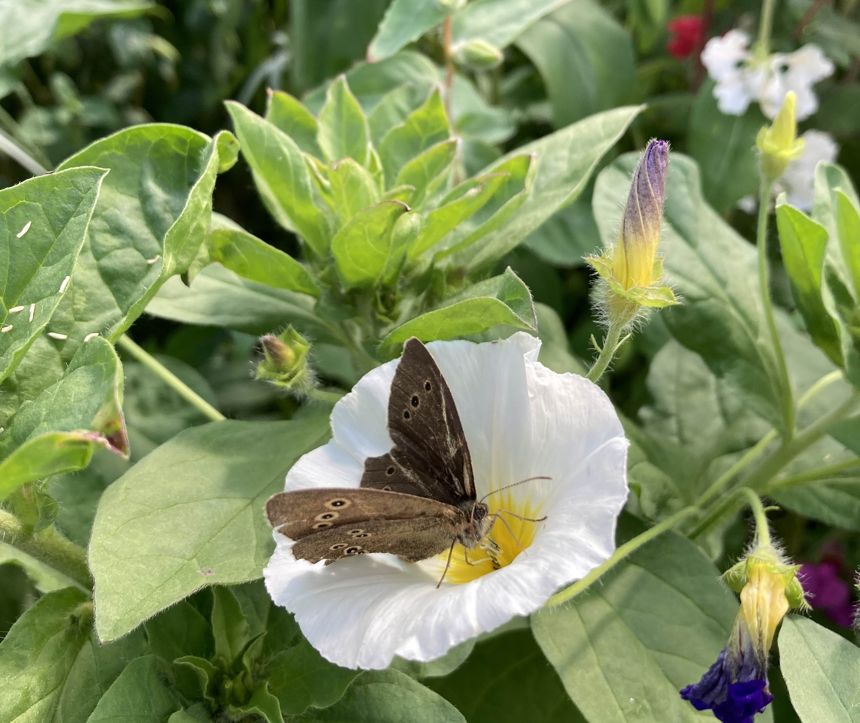 Similarly, apart from the erratic flit of cabbage whites, there have been few butterflies. I did see a painted lady the other day and there has been a tortoiseshell now and again but they have been few and far between. The most numerous butterfly has been the ringlet, a medium-sized brown butterfly that is not the most spectacular but is very charming – if an insect can have charm. I was following one around the garden trying to get a photo and it eventually settled to feed on a white ‘belle de jour’ (Convolvulus tricolor) – the seeds were French and they use this common name which is a bit less scary than ‘annual bindweed’.