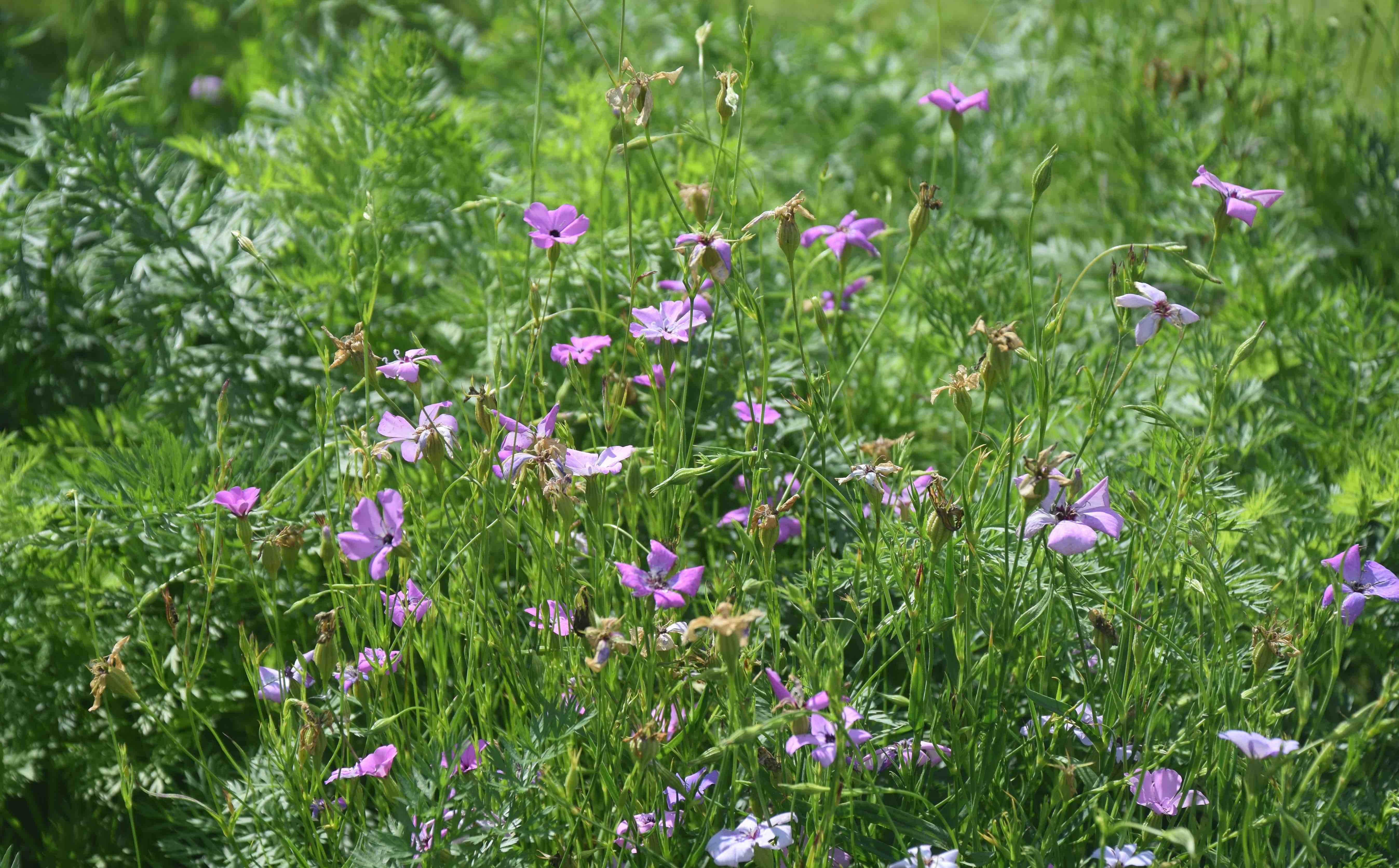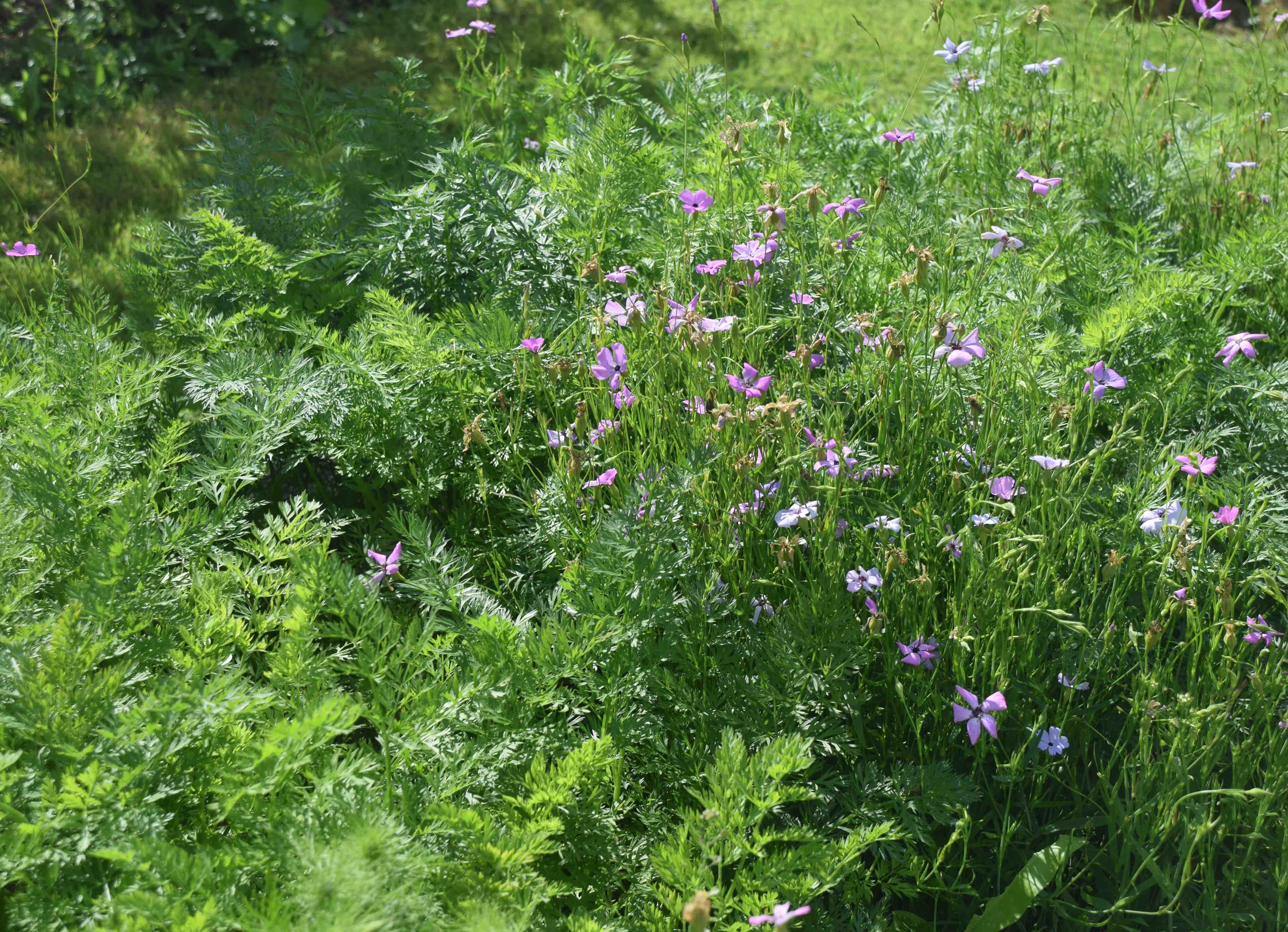 Between the rows I sowed viscaria, an easy annual with slight, slender stems that would not smother the carrots. Tagetes would be better because their pungent smell would mask the smell of the carrots and help prevent carrot fly but they are bushy and elbow out the carrots unless you give them lots of space. As it is, the viscaria seems to be completely ignored by pollinators. I have not seen a single bee, butterfly or hoverfly on the flowers. But they make the bed look a bit more attractive, although carrots are almost worth growing for their leaves alone.