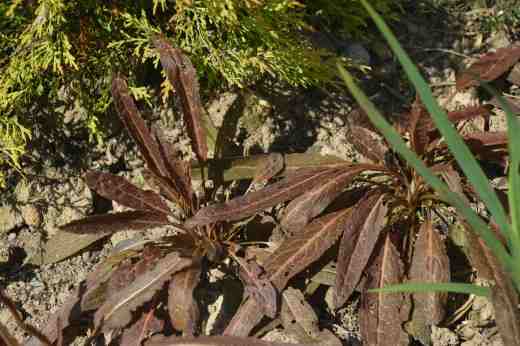 Sown in spring, they germinate without any special treatment and I planted some out in May in the seaside garden. The idea is that they look like seaweed so I put some in the raised beds in the seaside garden. However, despite them never obviously attacking wild docks, the snails immediately devoured the seedlings. I was more than annoyed. But some of the plants managed to grow through the attacks. The rest of the batch were planted in a flower bed under a golden conifer and around a patch of crocosmia. Here they have grown well.
