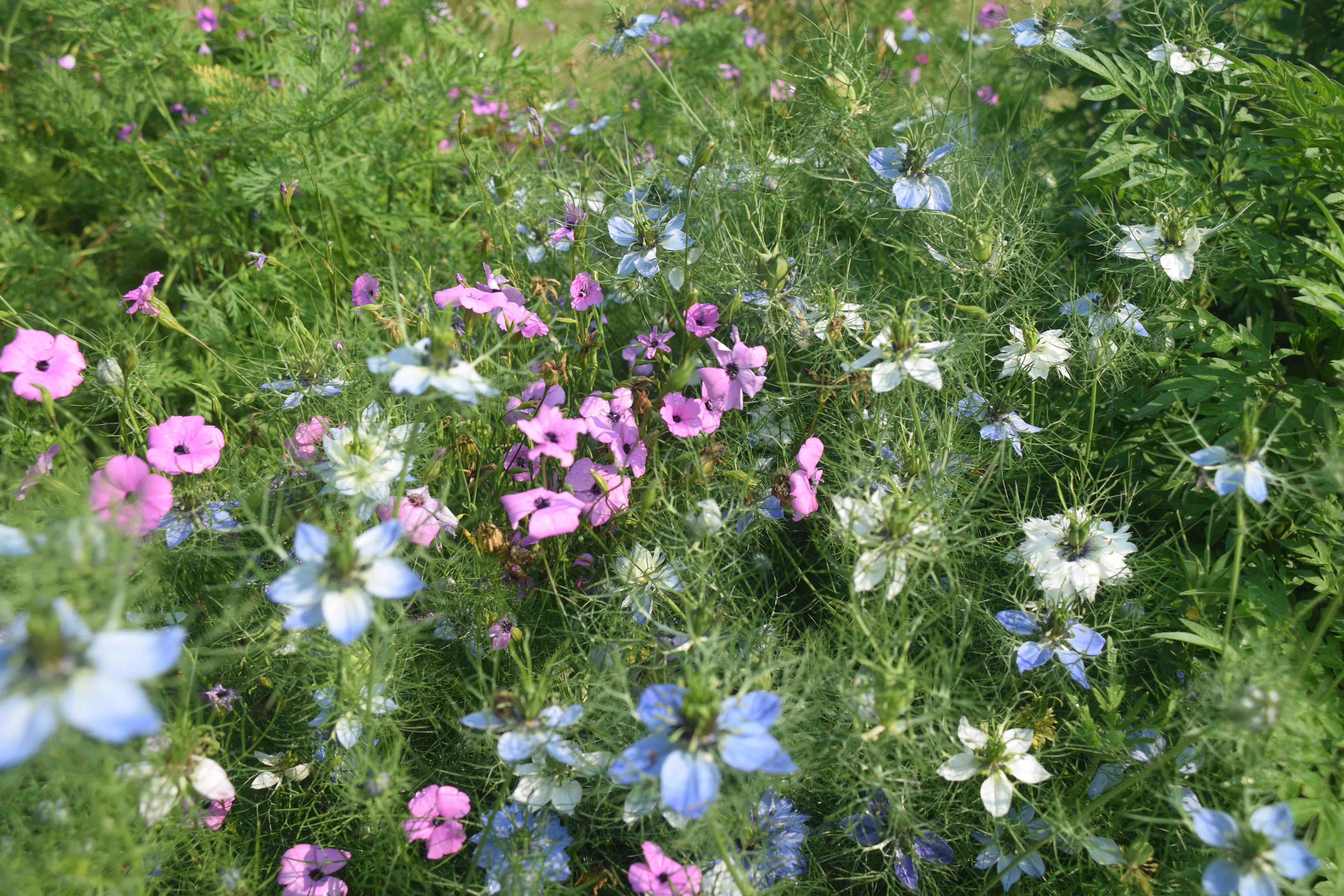 In my raised bed where I attempted carrots this year (with some success) I sowed some annuals. This was to fill gaps left where the carrots did not germinate well. It was dry in spring and I struggled to keep the bed constantly moist, having to carry cans down the garden to them. Germination was a bit erratic. I also sowed some annuals every third row. These were viscaria. Viscaria occulata is an old-fashioned annual with slender leaves and a wispy habit. It has the virtue of flowering over a long period compared to most annuals though the habit is a bit straggly – not a problem when it is flopping against the carrot leaves. Unfortunately it has suffered some really severe nomenclatural ‘fiddling’ and is listed as both Silene coeli-rosea and, it seems, more recently Eudianthe coeli-rosa which is really annoying! I sowed an inexpensive mix and hoped there would be plenty of the lavender flowers that I like the most but I really should have sown ‘Blue Angel’ to be sure of that. The mix is pretty though but is strangely completely ignored by bees of all kinds.
