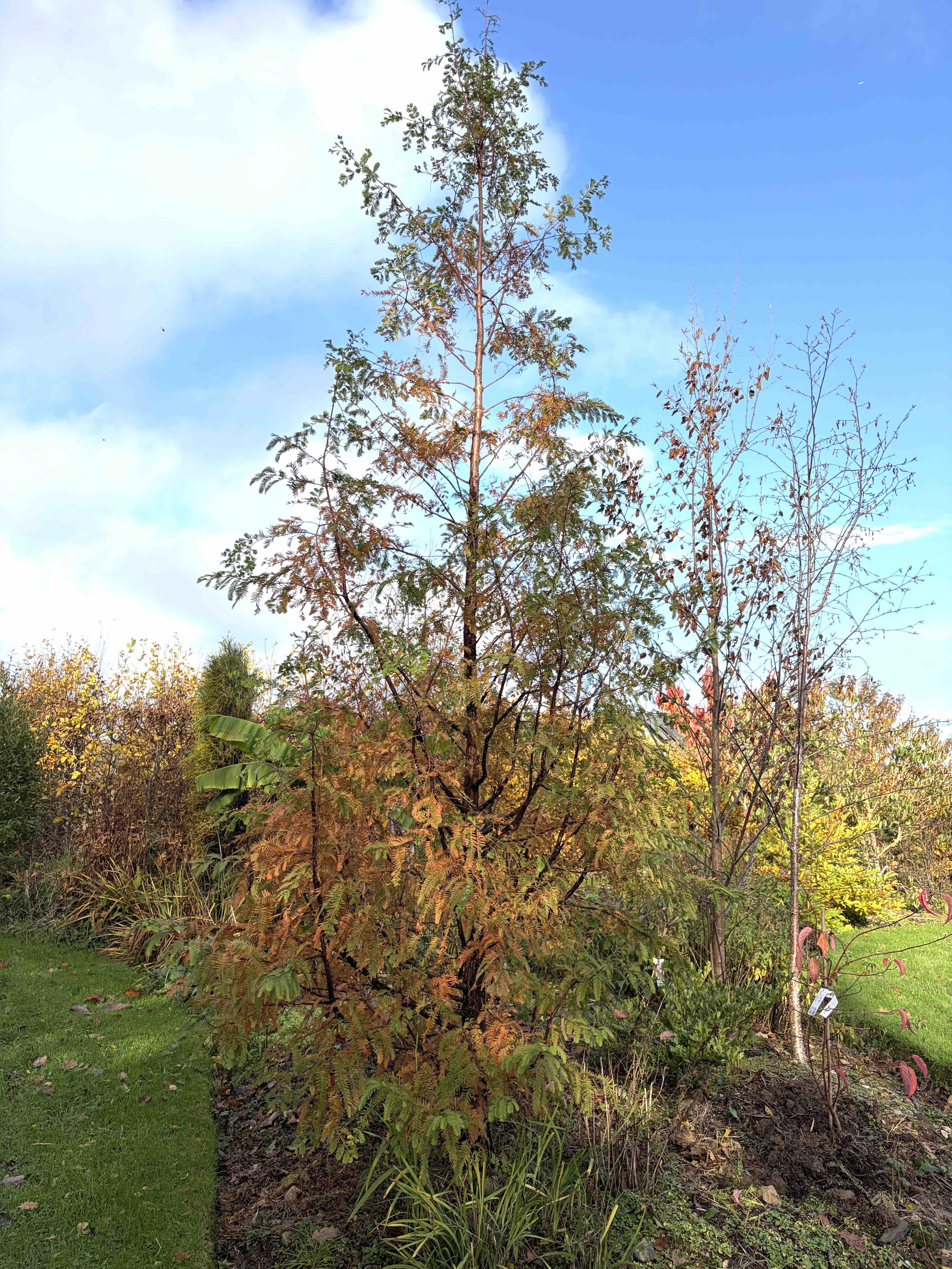It is now rocketing up and I often stand and admire it. So one day I thought ‘why not taxodium, the swamp cypress?’ Why not indeed. I have a dark larch and a couple of ginkgo so it would complete the set of deciduous conifers.