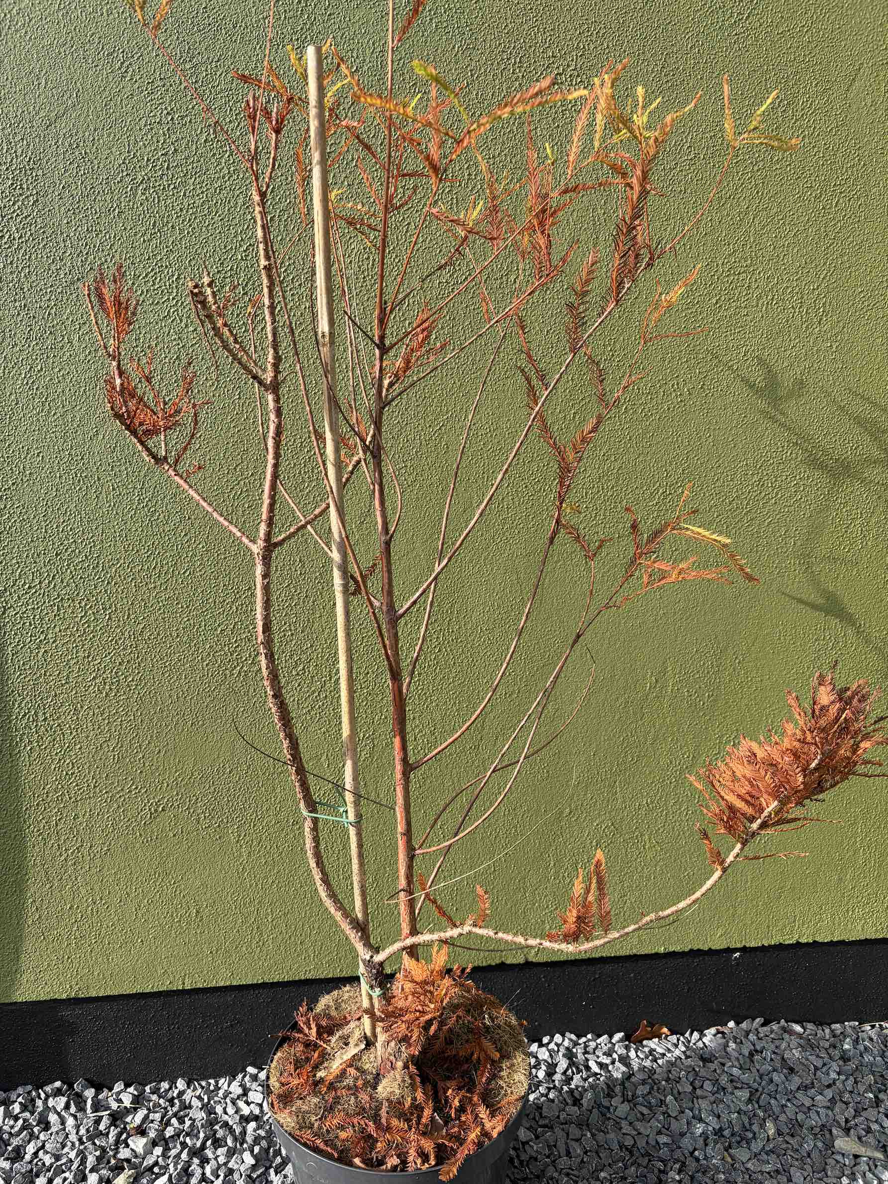 But as I was chatting to the owners, out of the corner of my eye I saw what looked like taxodium foliage. At the back of a bed was a taxodium, about 1m high and a bit cheaper than the big plants. I bought it immediately. And then I saw the label. It was ‘Pévé Minaret’, a Dutch selection with congested growth that only grows to about 2m or so. It is supposed to be narrow at first and then broadening with age. I like conifers and I like ‘weird’ forms but it is not quite what I had in mind. But the problem is that the plant I initially saw was the ‘stock’ taxodium, quite literally. The plant is obviously grafted and the rootstock has sent up a shoot that is now taller than the graft (scion).