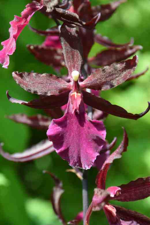 In all orchids the flowers are zygomorphic, a great word that means that the flowers have bilateral symmetry. If you draw a line from the top of the flower to the base the two halves are identical. The other case is actinomorphic where you can divide the flower into two identical halves in several planes.