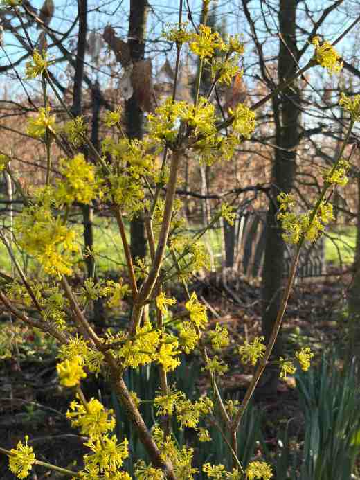 And then there is Cornus mas ‘Kazanlak’, a fruiting form of the species from Bulgaria. It is still young and had a few flowers last year. This year it is bigger and is flowering well. The blossoms are tiny but create a golden haze. There were no fruit last year and the rotten weather is not likely to result in any this year either but I keep my fingers crossed for my first taste of Cornelian cherry later this year.
