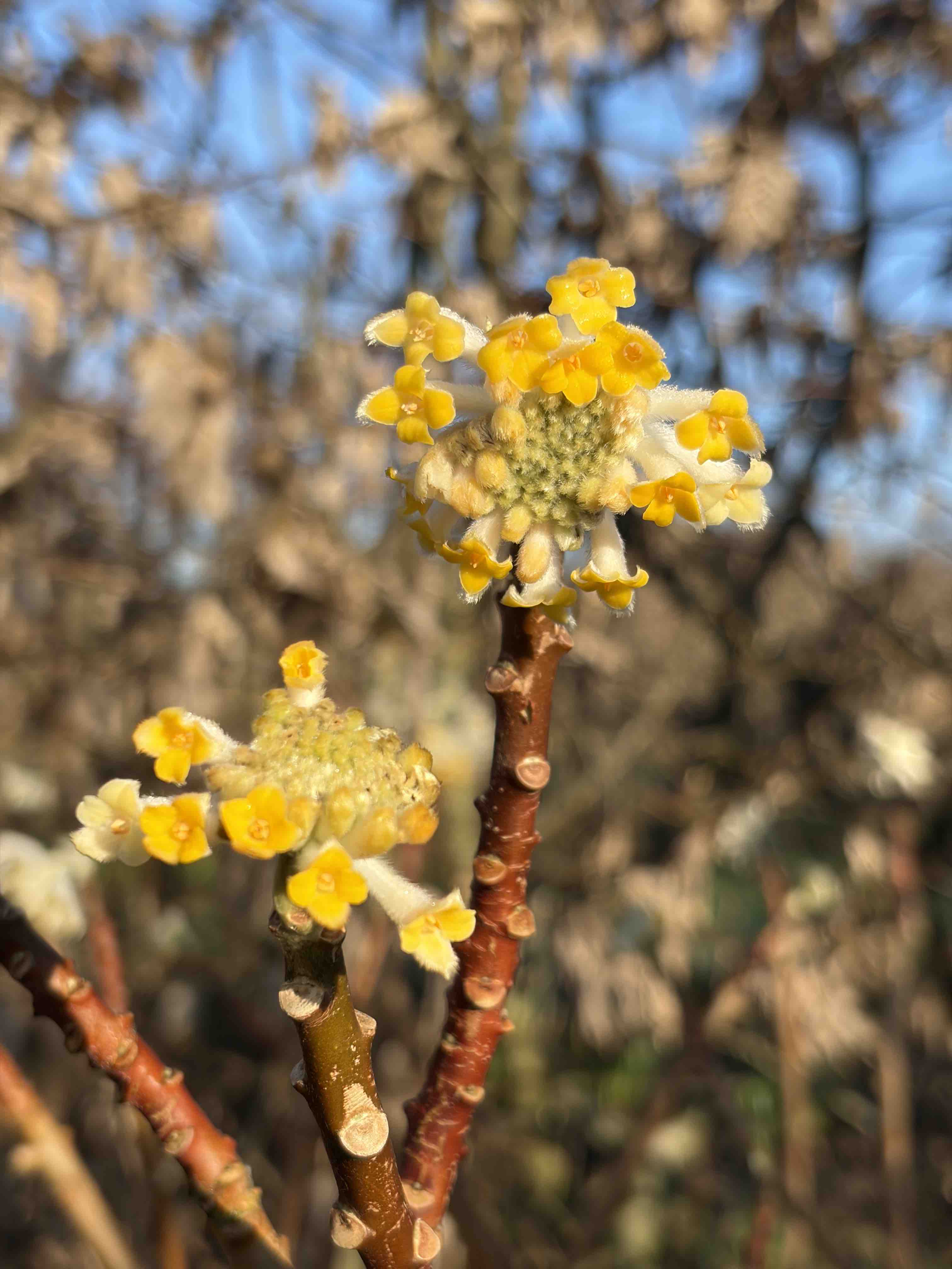 Not far away, the flowers are opening on the edgeworthia. I actually have two and the original was planted in as much shelter, and thus shade, as I could provide because it is not terribly hardy. Unfortunately this sheltered spot also shelters snails and I know of no other shrub that is as delectable to molluscs. The foliage and stems are constantly eaten, though the plant does, slowly, get bigger. But I was then gifted a second plant and that has been planted in a brighter spot, encouraged by the hardiness of the first. And this is opening its first blooms. Although always described as fragrant I never detect a lot of scent but the flowers are pretty.