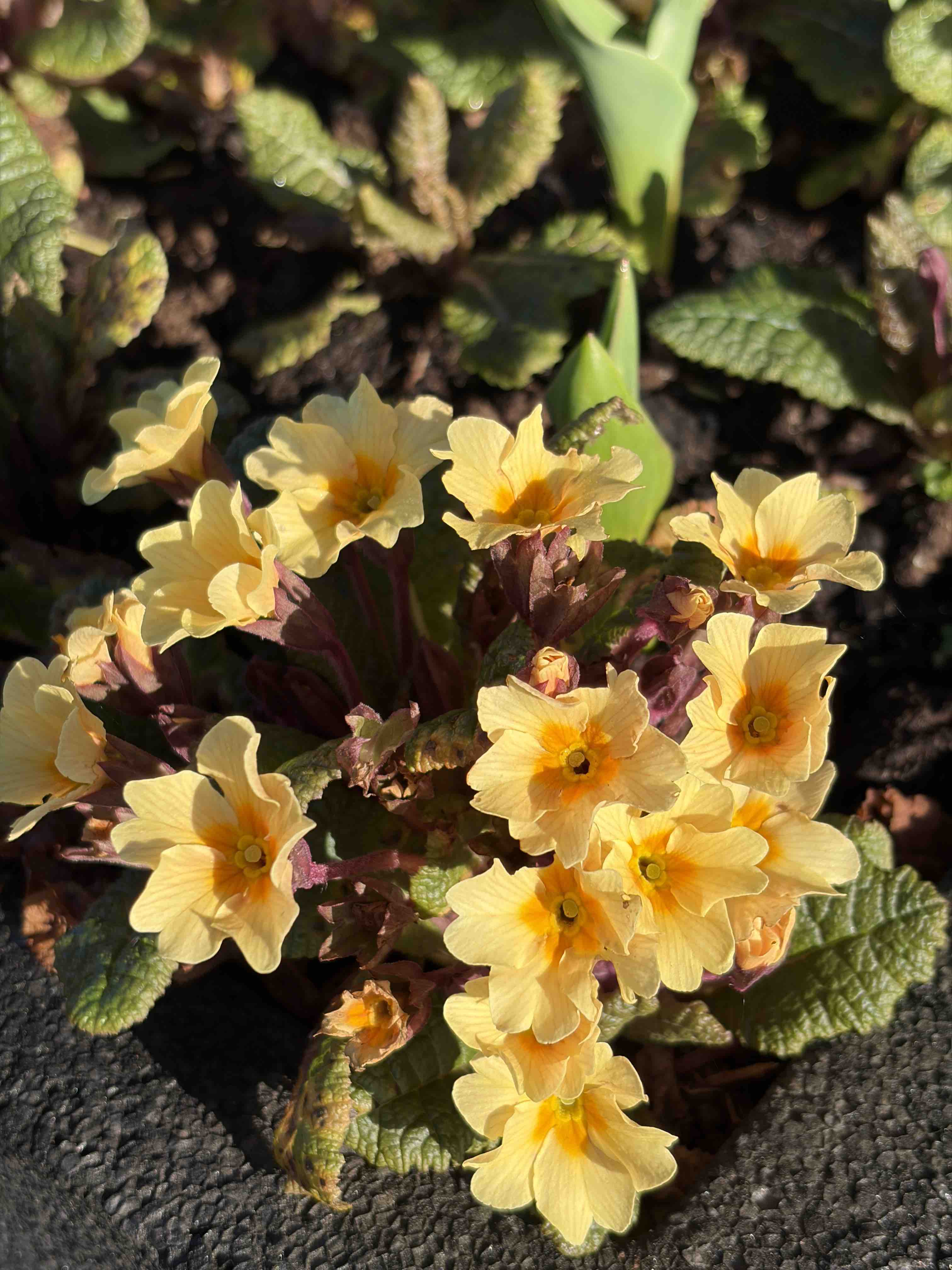 A welcome splash of sunshine is also provided by the primula ‘Osiered Amber’. These were sown last summer and are from Barnhaven primulas, the best place to get great primroses. It has typical primrose form but the leaves and flower stalks are flushed with red and the flowers are of a more golden shade than typical primroses. The plants are in patio pots and a bit battered by wind and rain but looked happy in the sun. Unlike the monstrous giants in garden centres now, the Barnhaven strains are hardy and cope with the weather. ‘Osiered Amber’ is always my favourite because, although domesticated, it has not lost the charm of the original. Of course there are some fancier kinds starting to bloom too. Primroses and polyanthus should be sown in summer and are not difficult as long as you remember that the seeds need light and cool temperatures to germinate, not always easy to provide in summer, even in Ireland,