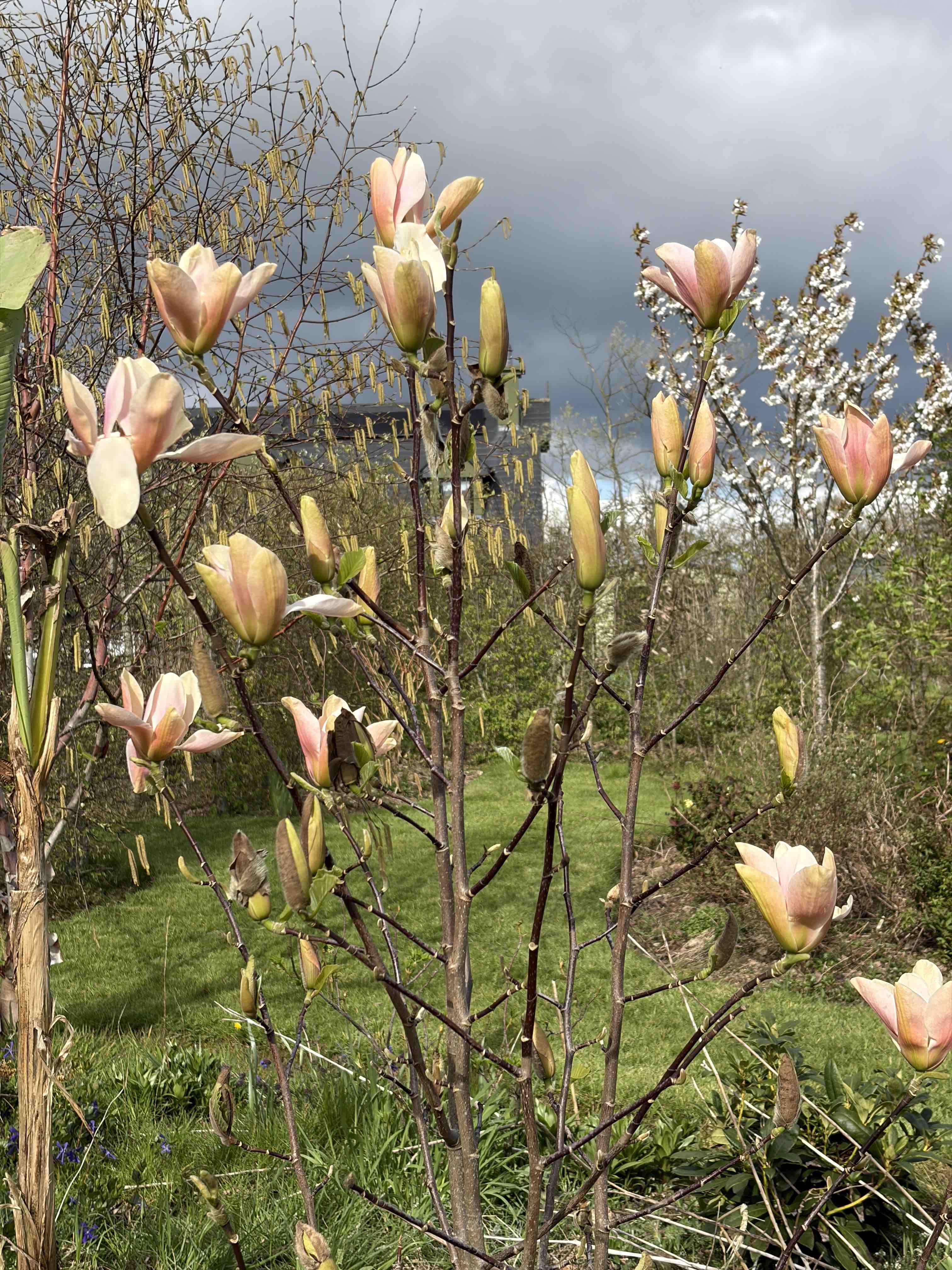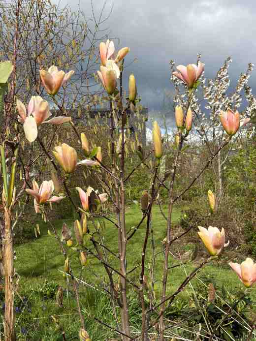 And so we have about 20 flowers open or opening. I will make sure I feed it to give it a boost after the effort of blooming and encourage strong growth this summer. In the adjacent bed I have M. acuminata ‘Blue Opal’ which, if it flowers, will also have strangely coloured flowers, but it is still small and I will have to wait a few more years for blooms. But I have learned that patience does pay off and in the meantime I hope to see lots of ‘Peachy’ flowers in the intervening years.