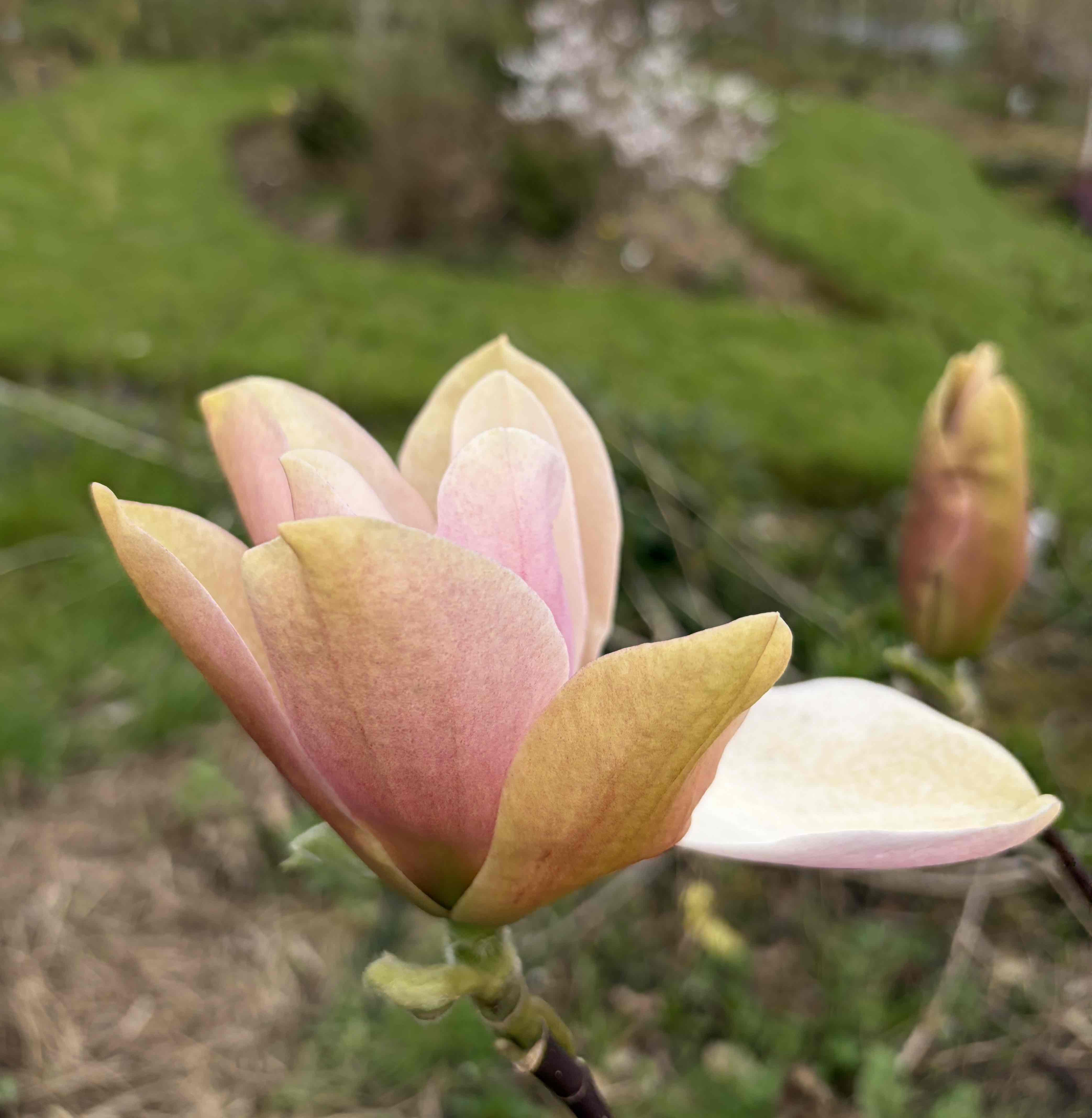 When the garden was in its infancy some of the early plantings struggled because the soil was not very well prepared. Some plants died. A large, free-form bed was planted with a named birch, some birch whips, a special rhamnus, a metasequoia and a banana – an eclectic mix to say the least. Most have done well, after a slow start, and I have to admit that the metasequoia has become my favourite tree in the garden. In fact I admire it so much I have planted another. I also planted a magnolia. I had intended to plant a lot more magnolias and, in fact I did, but not all have done well – some died. I splashed out on this bed and planted Magnolia ‘Peachy’. It was a small plant but it did not die.